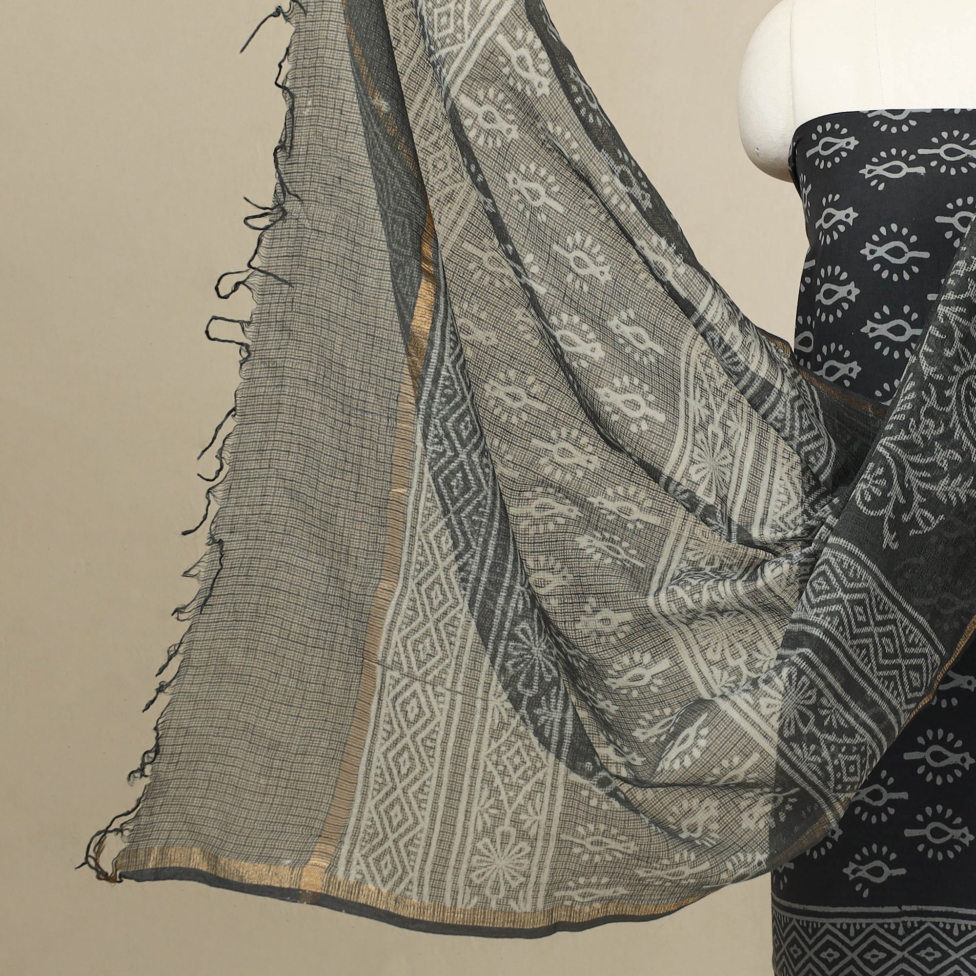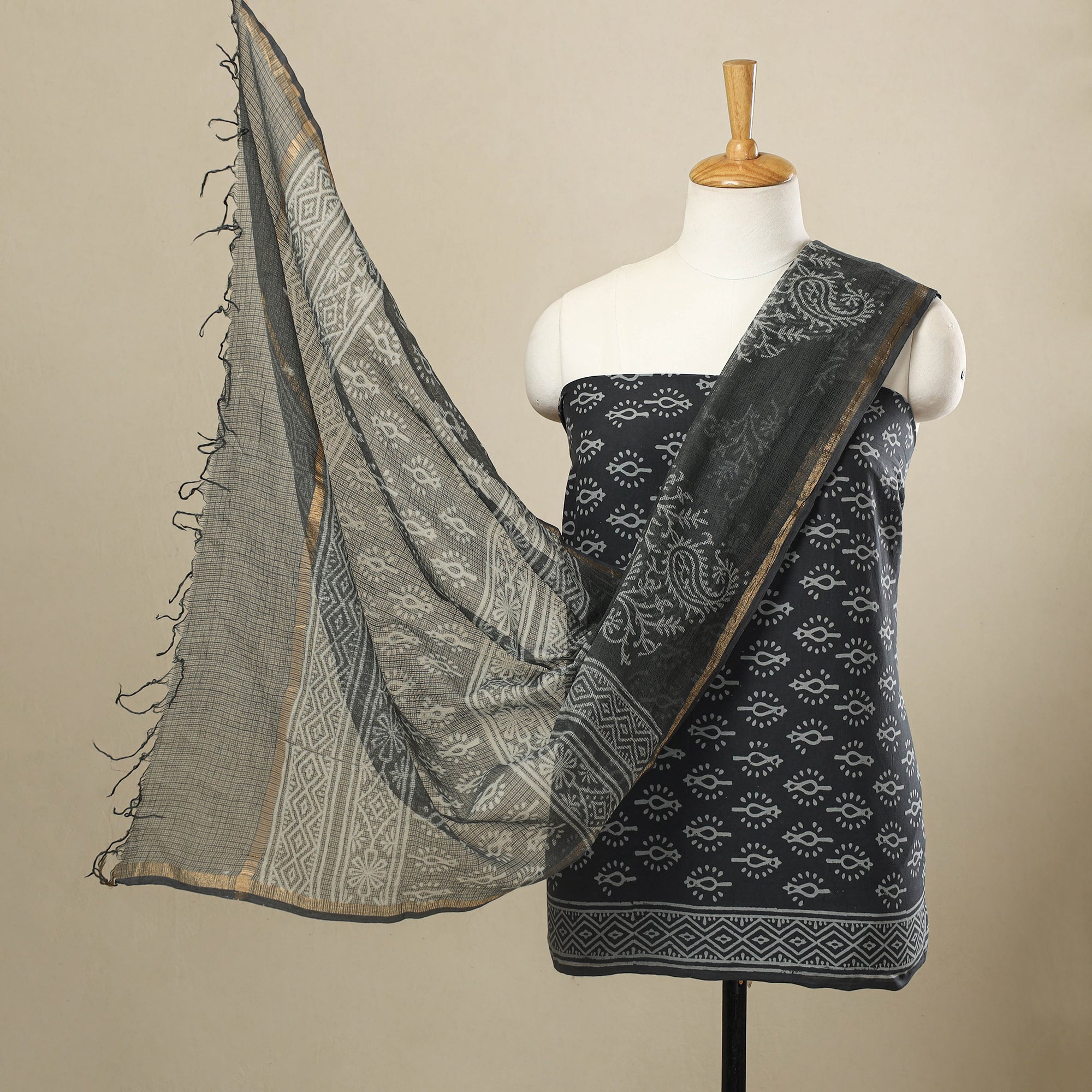 Wrap yourself in timeless Jaipur artistry with this beautiful 3pc cotton grey jaipur print dress material. Crafted using traditional techniques from Jaipur, Rajasthan, this fabric celebrates the region’s rich textile legacy. It comes paired with a lightweight kota doria dupatta breathable and full of ethnic charm perfect for festive occasions or to add grace to your everyday wardrobe.