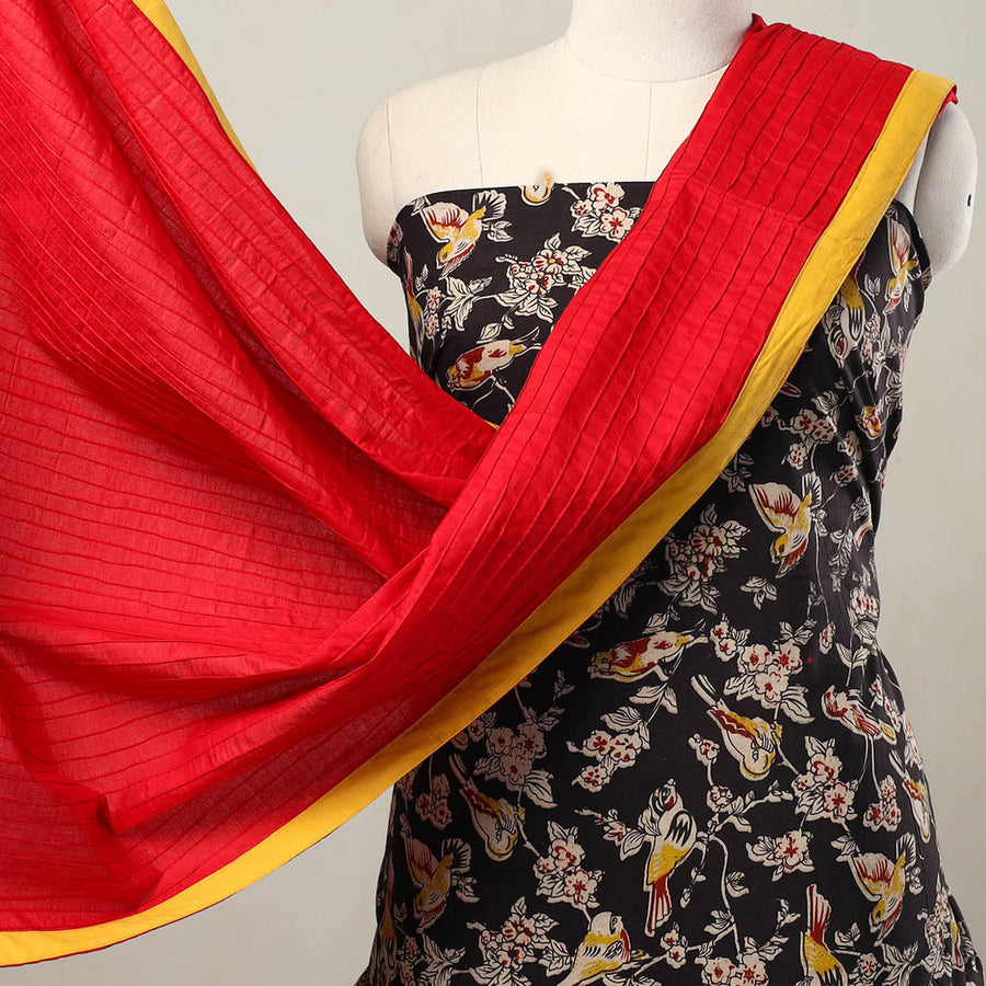 This black 3pc cotton kalamkari print kurta with plain dupatta beautifully blends tradition and elegance. Crafted from cotton, it features vibrant, intricate pattern. The set includes a beautiful pintuck cotton dupatta and bottom, making it perfect for weddings, festivals, or family gatherings.