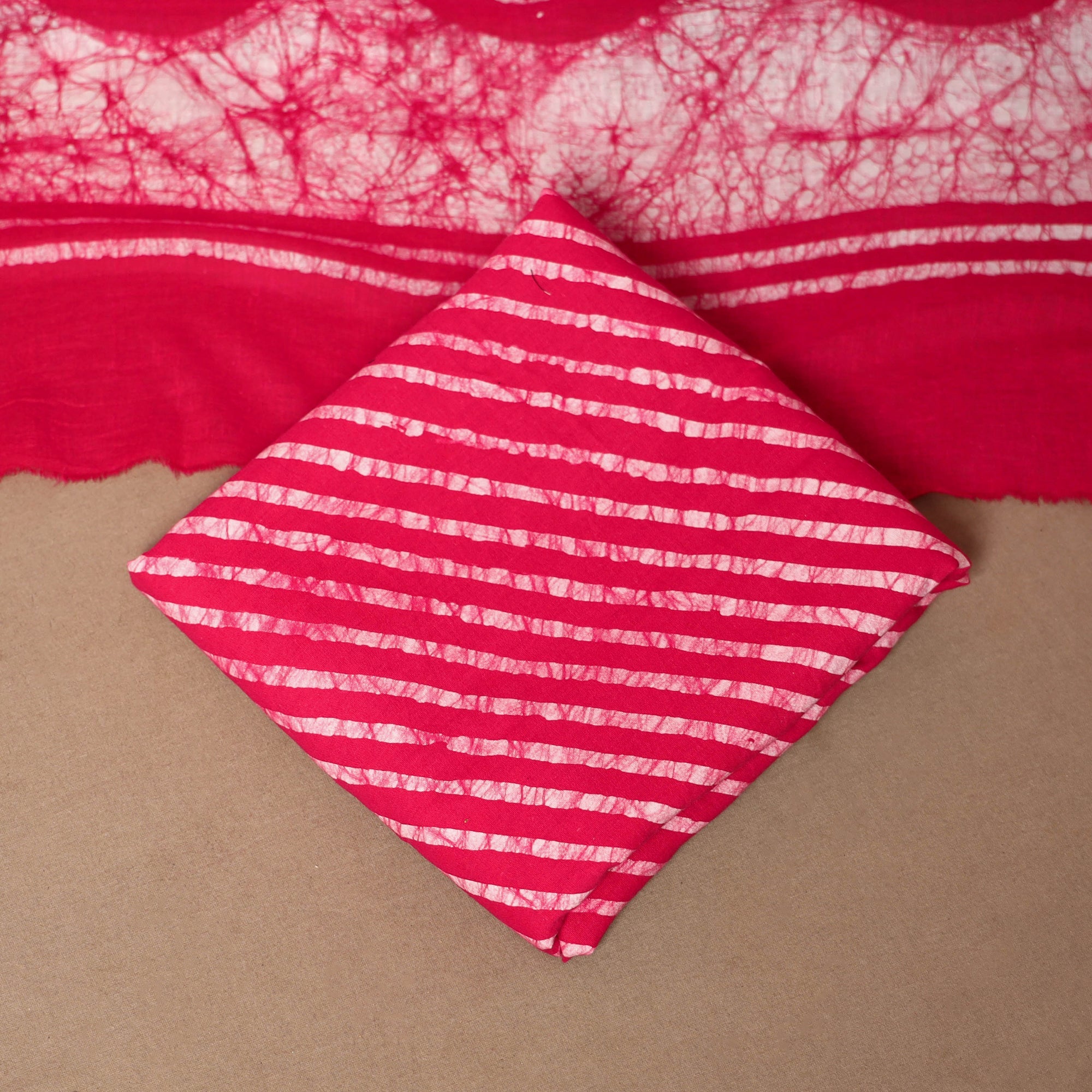 Pink 3pc cotton set crafted in Kutch showcases the elegance of batik. Made using the age-old wax-resist dyeing technique it includes fabric for a kurta, a matching bottom and a dupatta. The motifs used in batik are often passed down through generations making each piece truly special. Perfect for festive occasions or everyday ethnic wear.