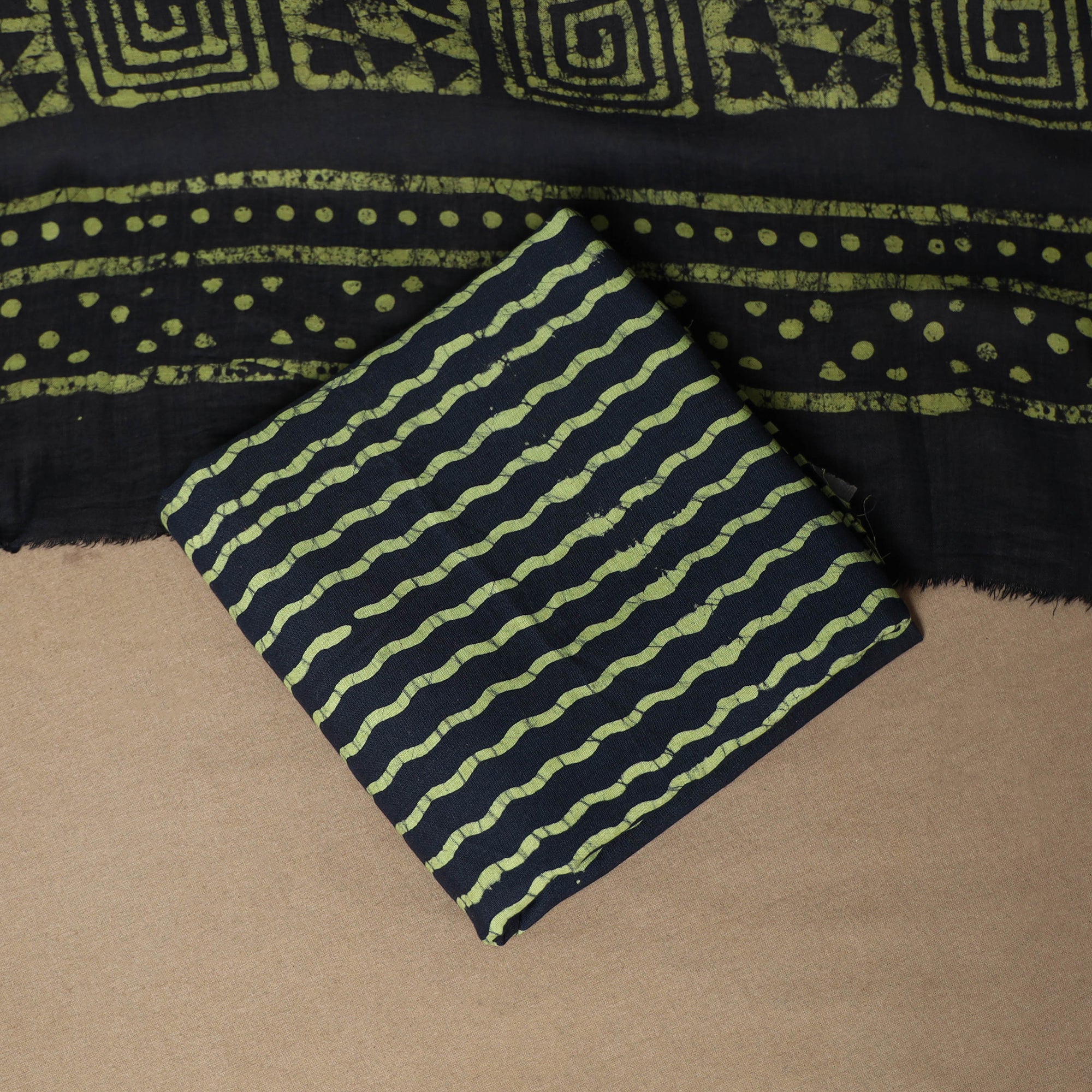 Green 3pc cotton set crafted in Kutch showcases the elegance of batik. Made using the age-old wax-resist dyeing technique it includes fabric for a kurta, a matching bottom and a dupatta. The motifs used in batik are often passed down through generations making each piece truly special. Perfect for festive occasions or everyday ethnic wear.