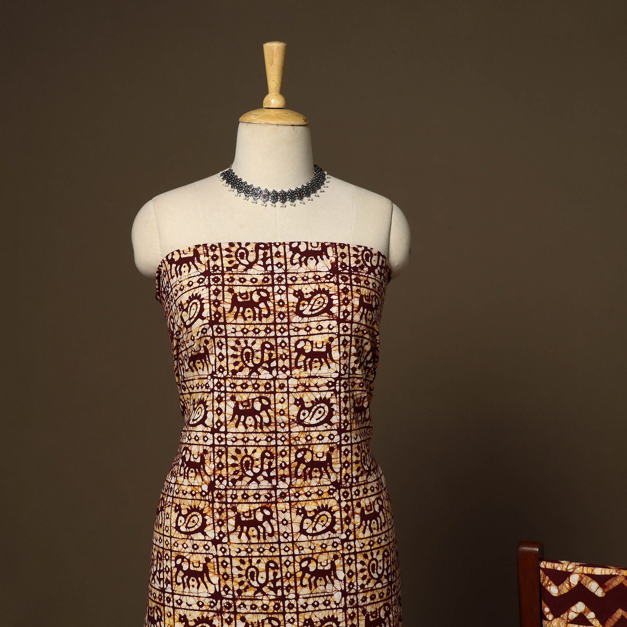 Maroon 3pc cotton set crafted in Kutch showcases the elegance of batik. Made using the age-old wax-resist dyeing technique it includes fabric for a kurta, a matching bottom and a dupatta. The motifs used in batik are often passed down through generations making each piece truly special. Perfect for festive occasions or everyday ethnic wear.