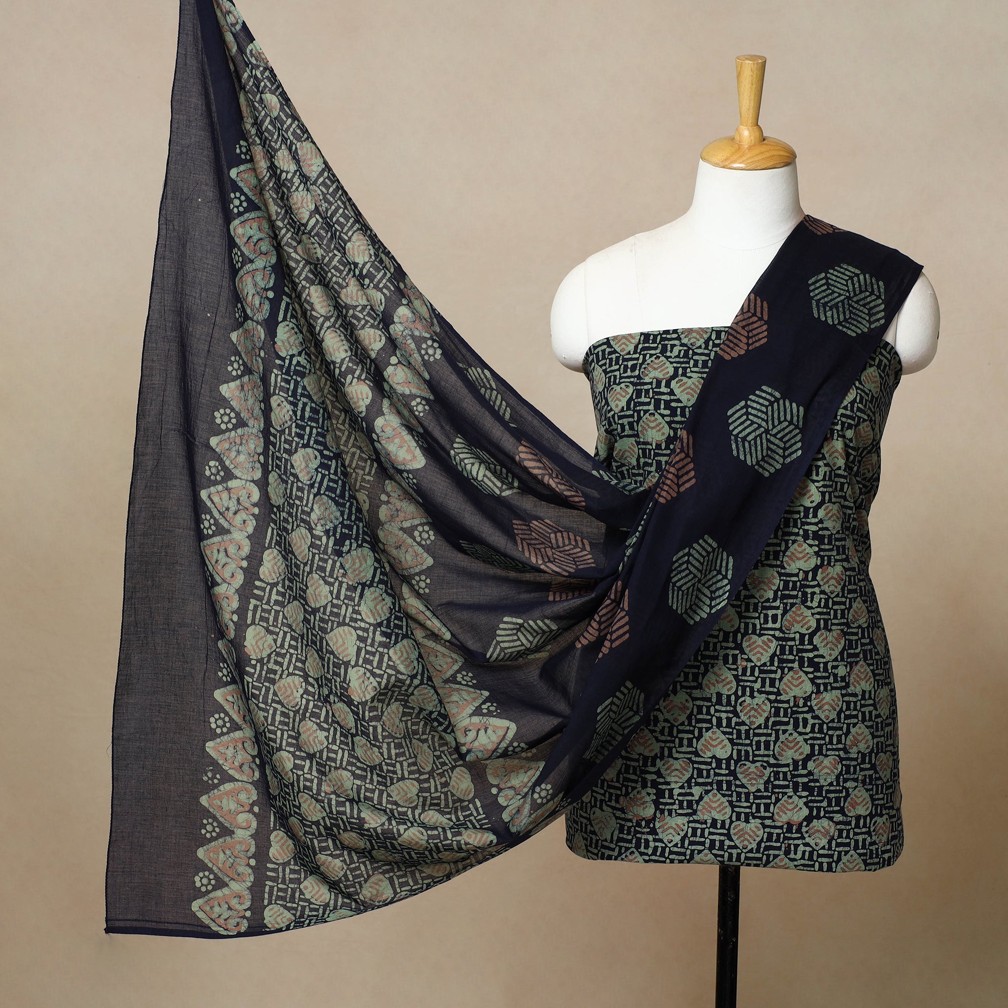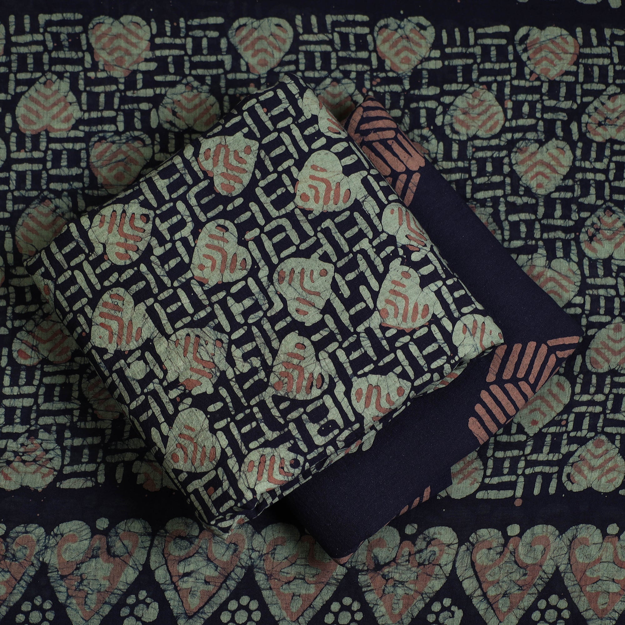 This 3pc cotton green kutch batik print dress material, Featuring traditional wax resistant dyeing techniques this set showcases intricate patterns that reflect Indias rich artisanal heritage. Perfect for creating stylish comfortable outfits, Ideal for both casual and festive occasion.