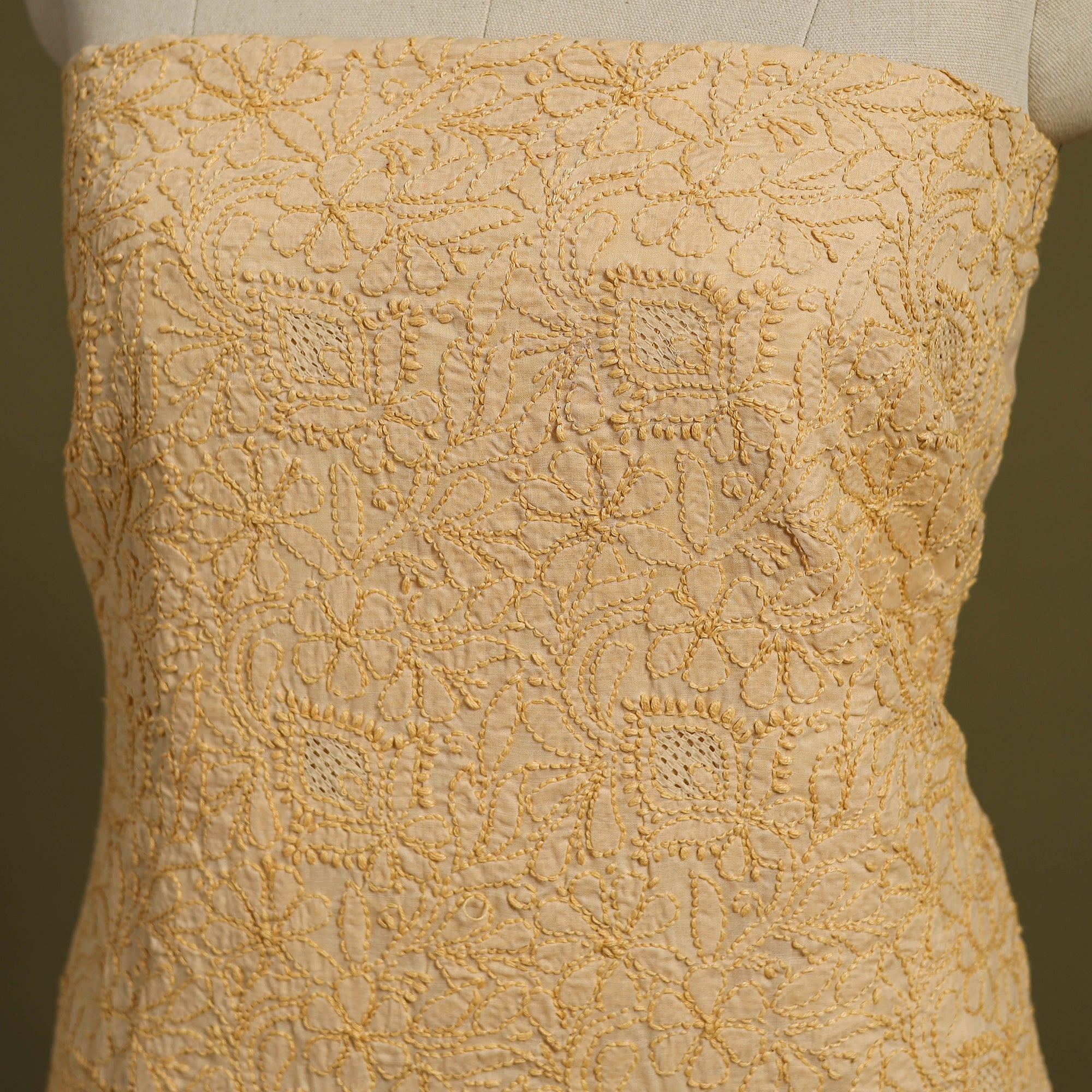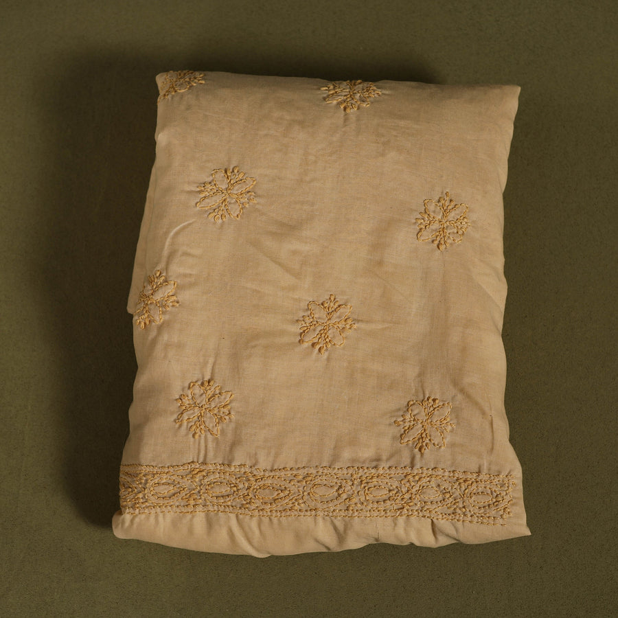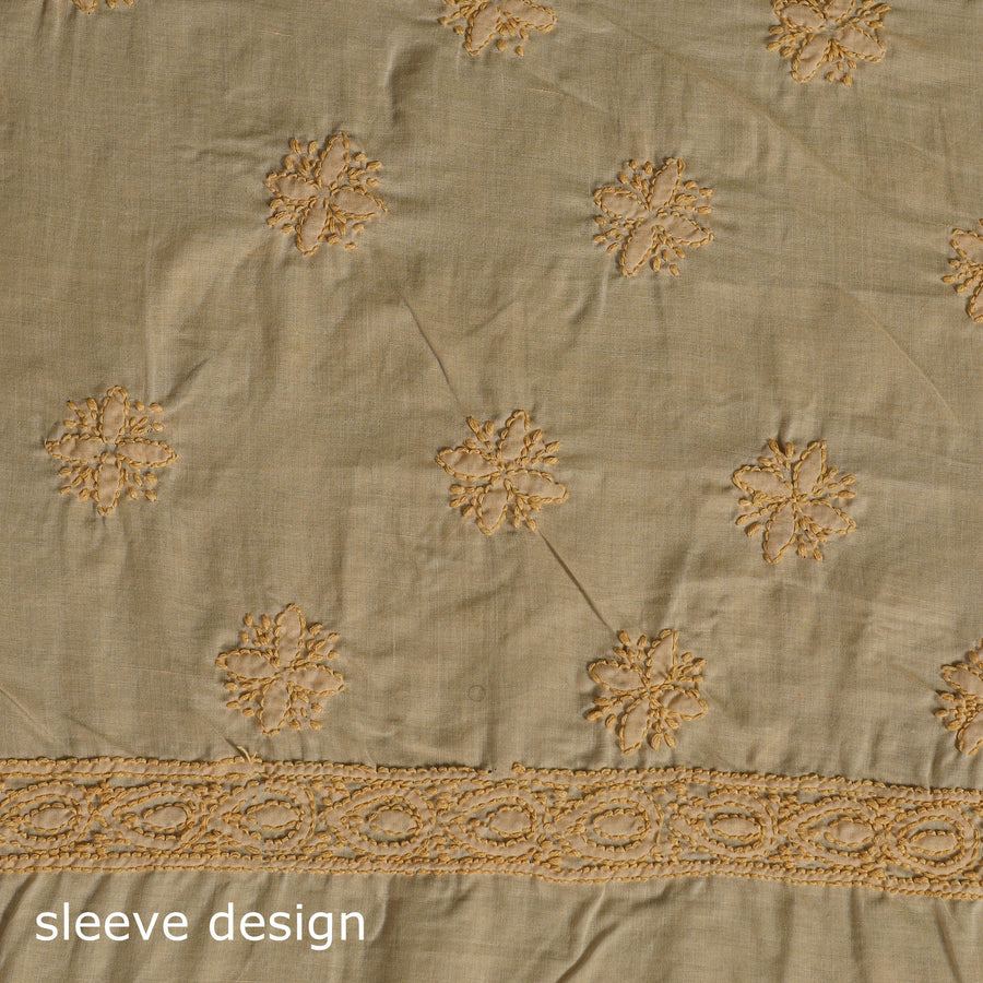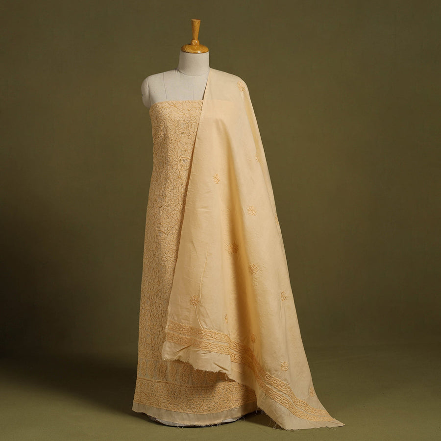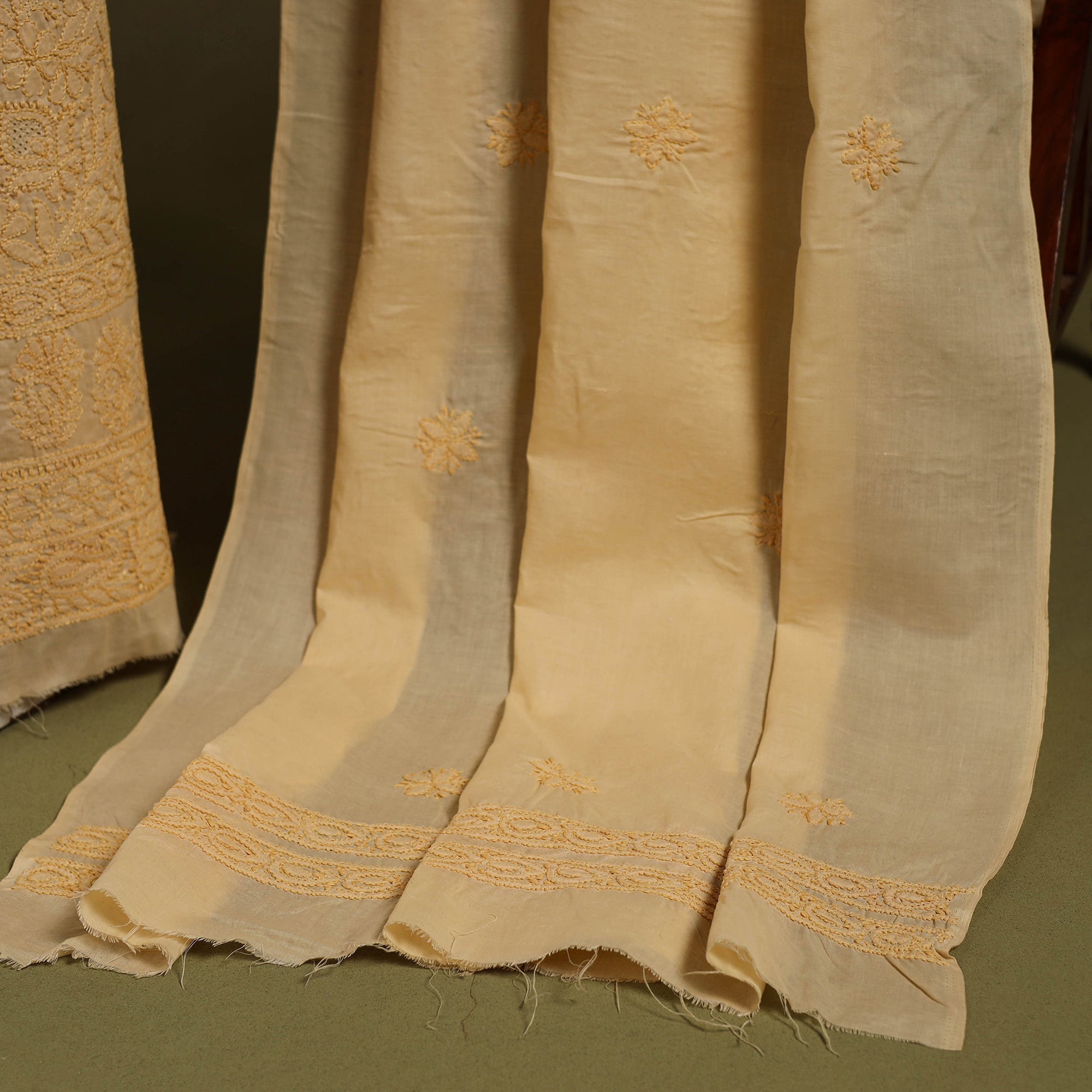 Step into timeless elegance with this 3pc beige cotton lucknowi chikankari dress material. Adorned with intricate embroidery, this set includes a stunning kurta, a matching bottom, and a complementing dupatta. Rooted in the rich heritage of lucknow, chikankari embroidery adds a touch of tradition to your wardrobe, making it a must have for both celebratory moments and graceful everyday wear.