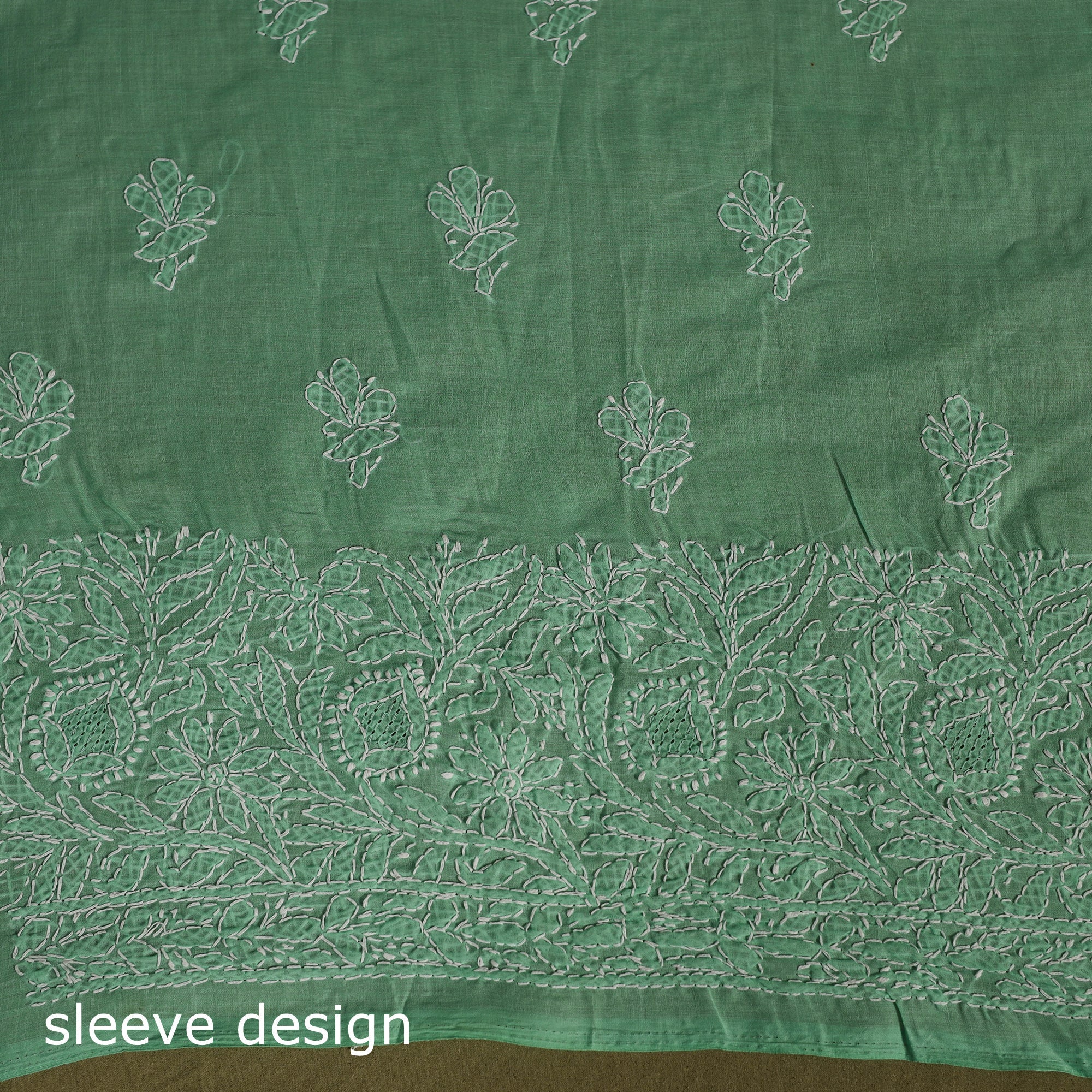 Step into timeless elegance with this 3pc green cotton lucknowi chikankari dress material. Adorned with intricate embroidery, this set includes a stunning kurta, a matching bottom, and a complementing dupatta. Rooted in the rich heritage of lucknow, chikankari embroidery adds a touch of tradition to your wardrobe, making it a must have for both celebratory moments and graceful everyday wear.