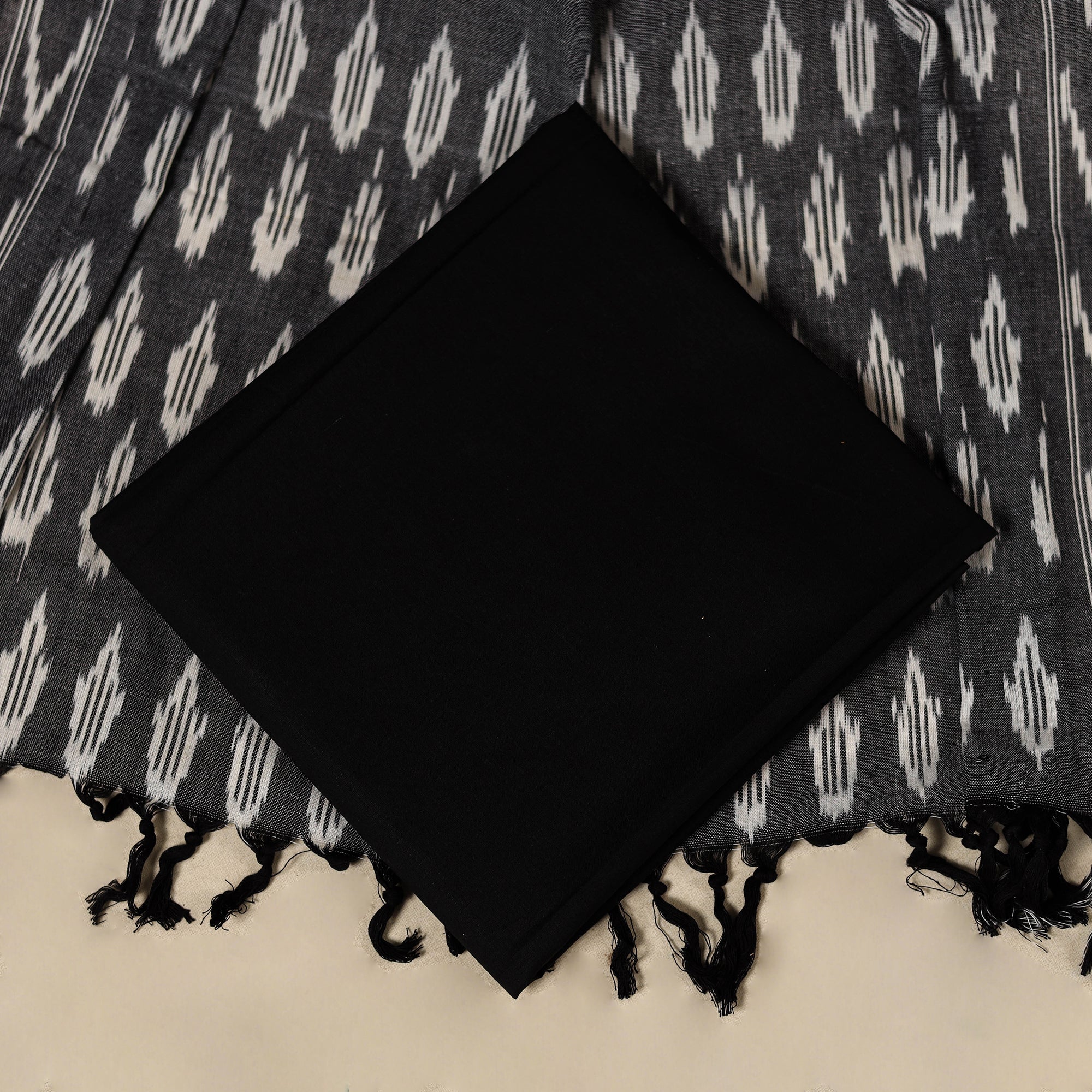 Embrace the beauty of grey 3pc cotton pochampally ikat dress material set from Telangana. This set includes a top/kurta, dupatta, and plain bottom piece. The intricate designs and vibrant colors of pochampally Ikat will lead you to stand out. Whether you are attending a wedding, a party, or a cultural event, this dress material is a timeless and best choice.