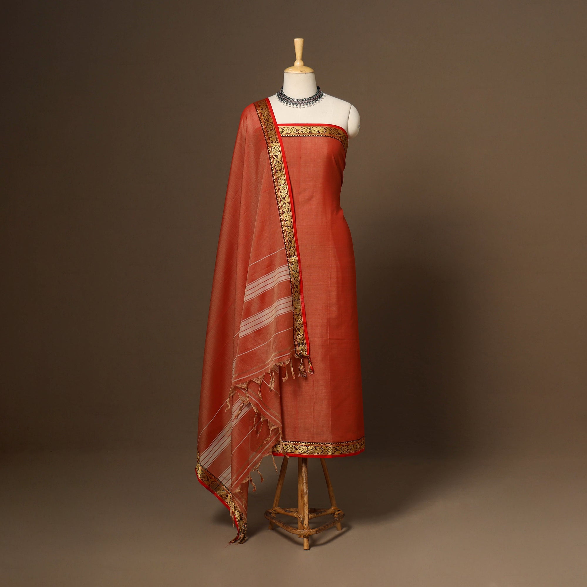 Orange 3pc cotton dress material set from Dharwad, Karnataka. This set is a tribute to the rich textile heritage of the region, featuring traditional woven border work that adds a touch of sophistication. The set includes a beautifully crafted kurta piece, a matching bottom/salwar piece, and a coordinating dupatta. Crafted with precision and care, this suit material set offers both style and comfort. Whether you're attending a festive occasion or a casual gathering, this ensemble is sure to make a lasting impression.