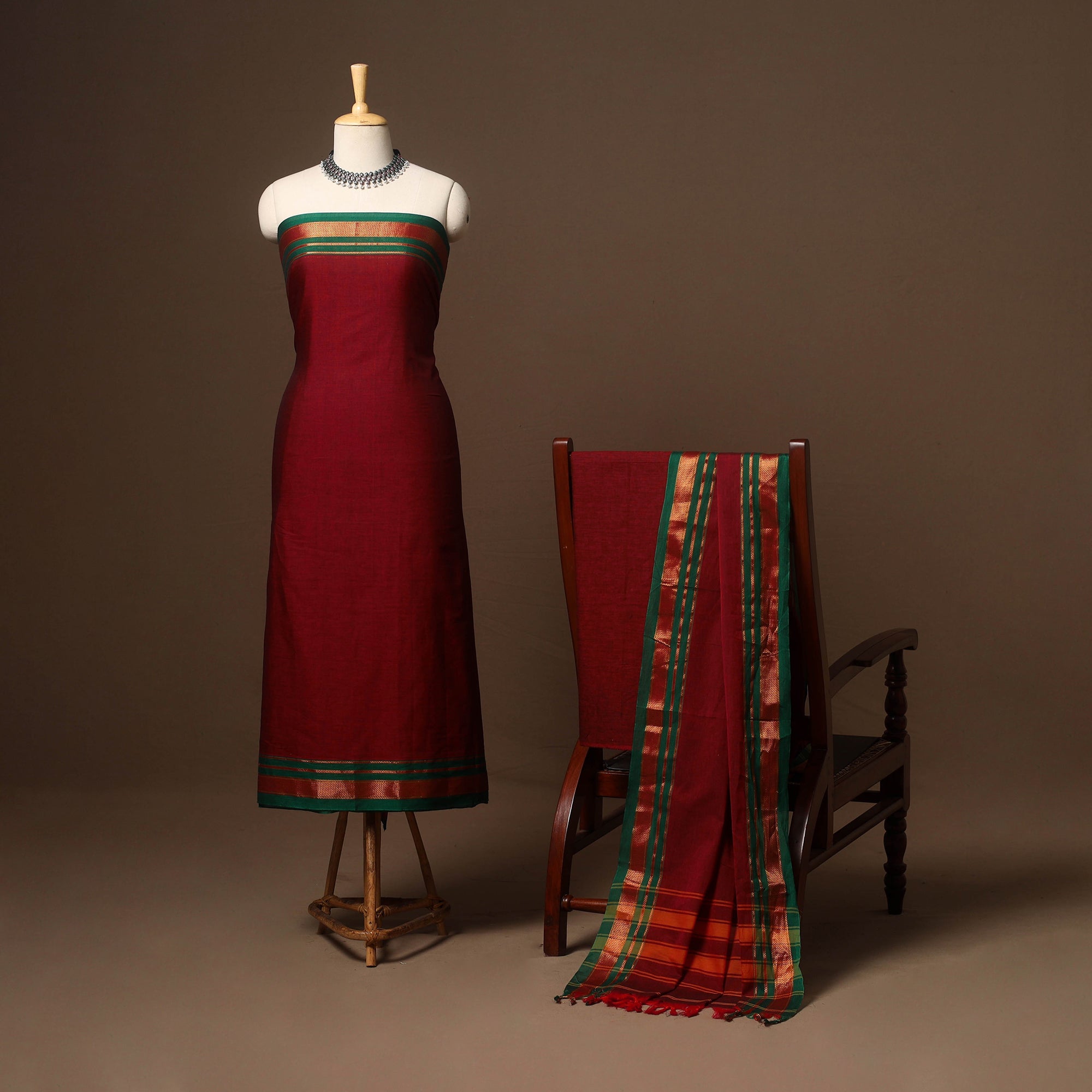 Red 3pc cotton dress material set from Dharwad, Karnataka. This set is a tribute to the rich textile heritage of the region, featuring traditional woven border work that adds a touch of sophistication. The set includes a beautifully crafted kurta piece, a matching bottom/salwar piece, and a coordinating dupatta. Crafted with precision and care, this suit material set offers both style and comfort. Whether you're attending a festive occasion or a casual gathering, this ensemble is sure to make a lasting impression.