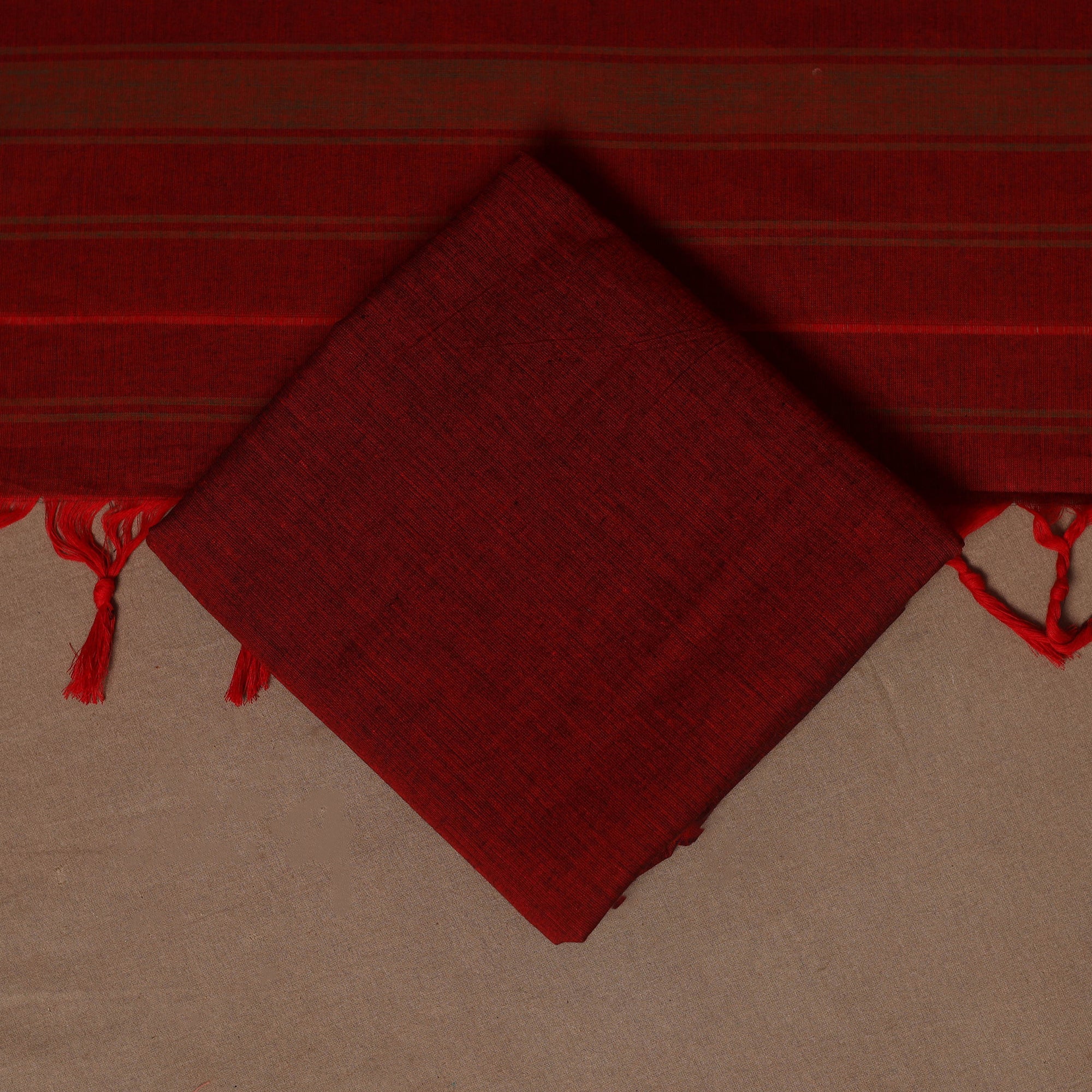 Red 3pc cotton dress material set from Dharwad, Karnataka. This set is a tribute to the rich textile heritage of the region, featuring traditional woven border work that adds a touch of sophistication. The set includes a beautifully crafted kurta piece, a matching bottom/salwar piece, and a coordinating dupatta. Crafted with precision and care, this suit material set offers both style and comfort. Whether you're attending a festive occasion or a casual gathering, this ensemble is sure to make a lasting impression.