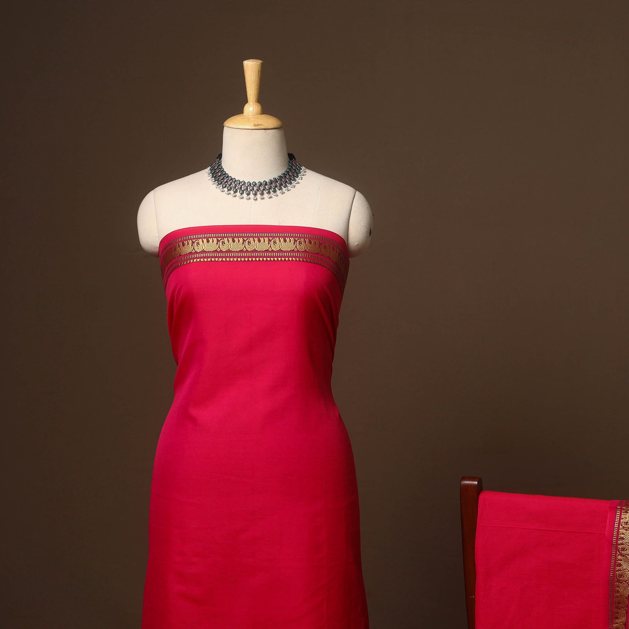 3pc cotton dress material set from Dharwad, Karnataka. This set is a tribute to the rich textile heritage of the region, featuring traditional woven border work that adds a touch of sophistication. The set includes a beautifully crafted kurta piece, a matching bottom/salwar piece, and a coordinating dupatta. Crafted with precision and care, this suit material set offers both style and comfort. Whether you're attending a festive occasion or a casual gathering, this ensemble is sure to make a lasting impression.
