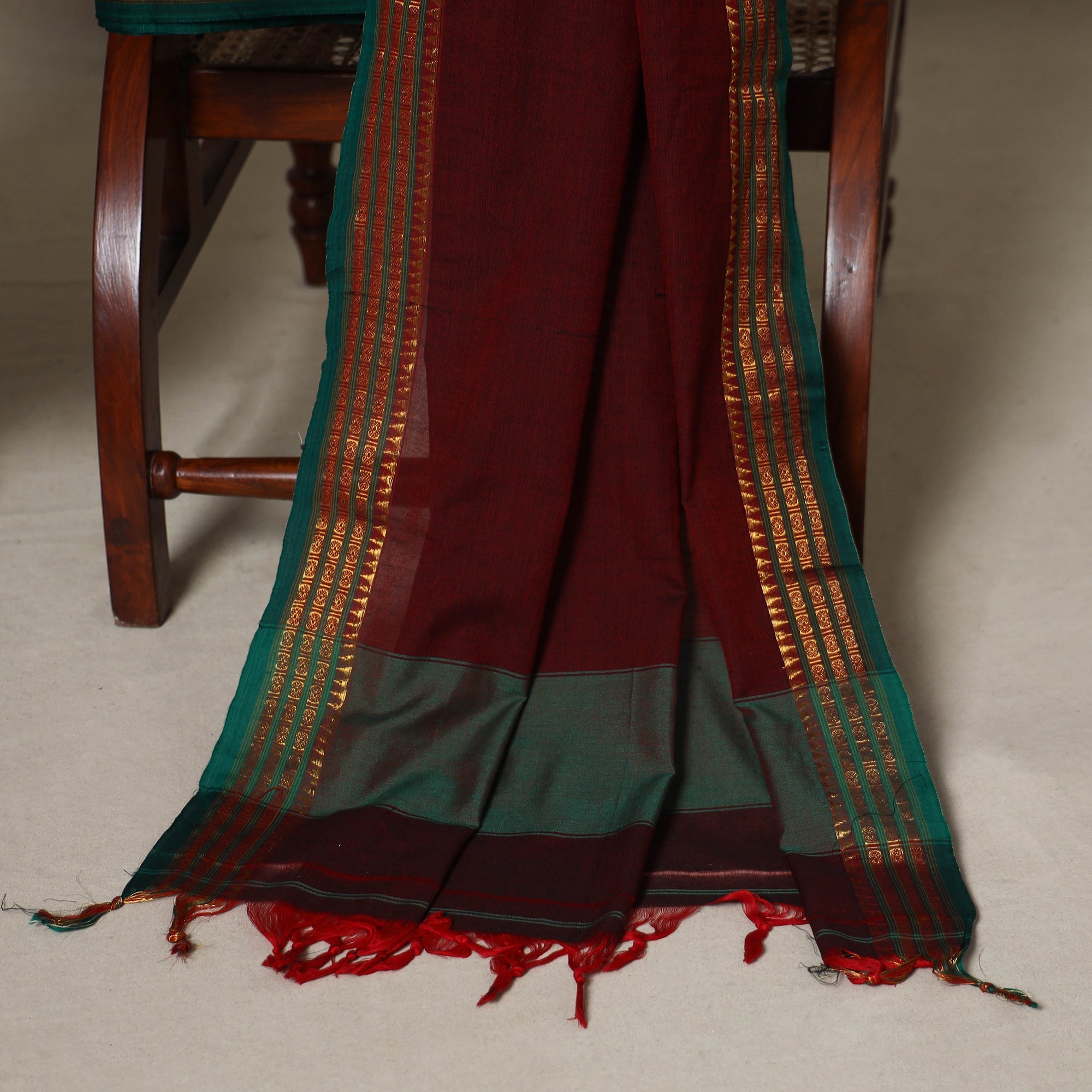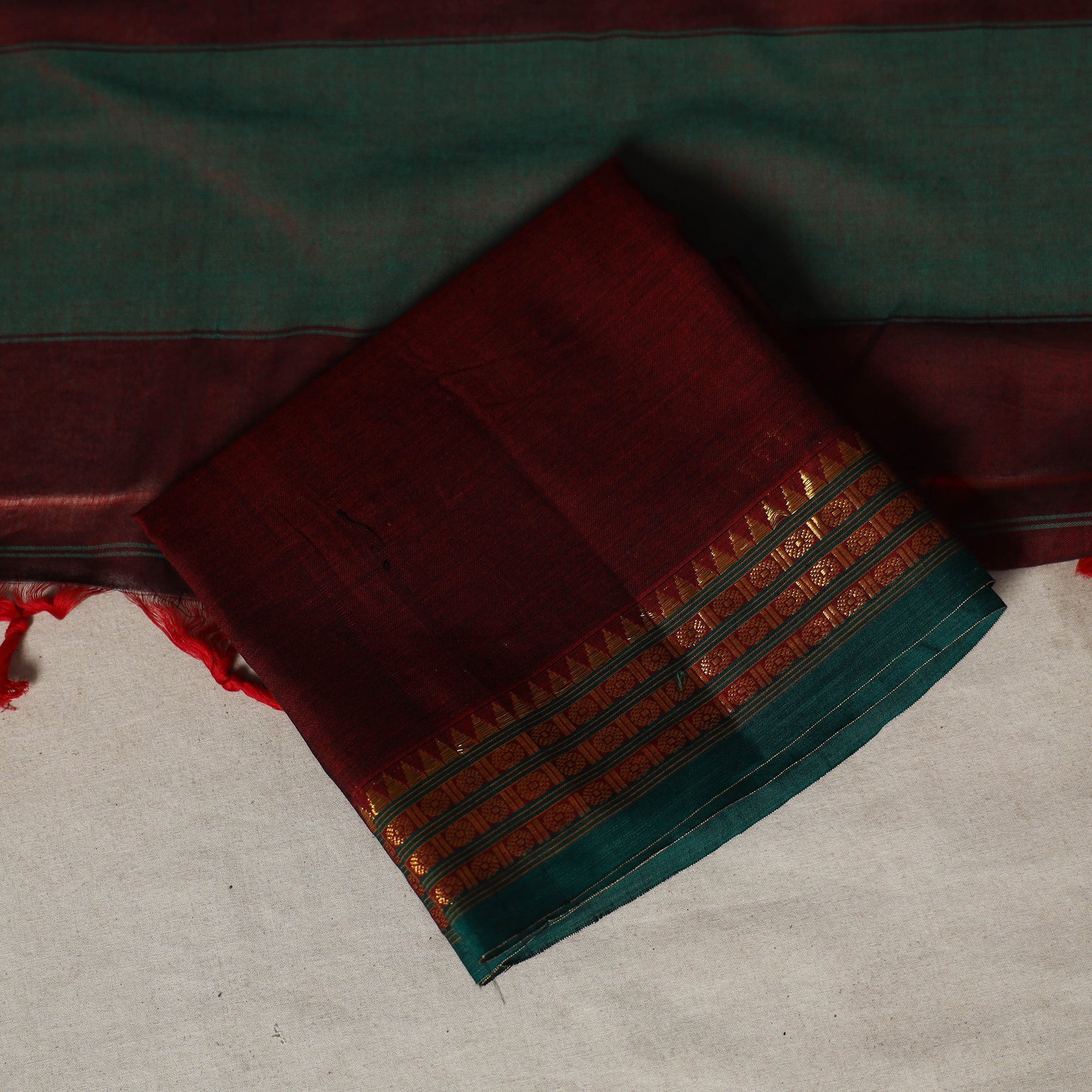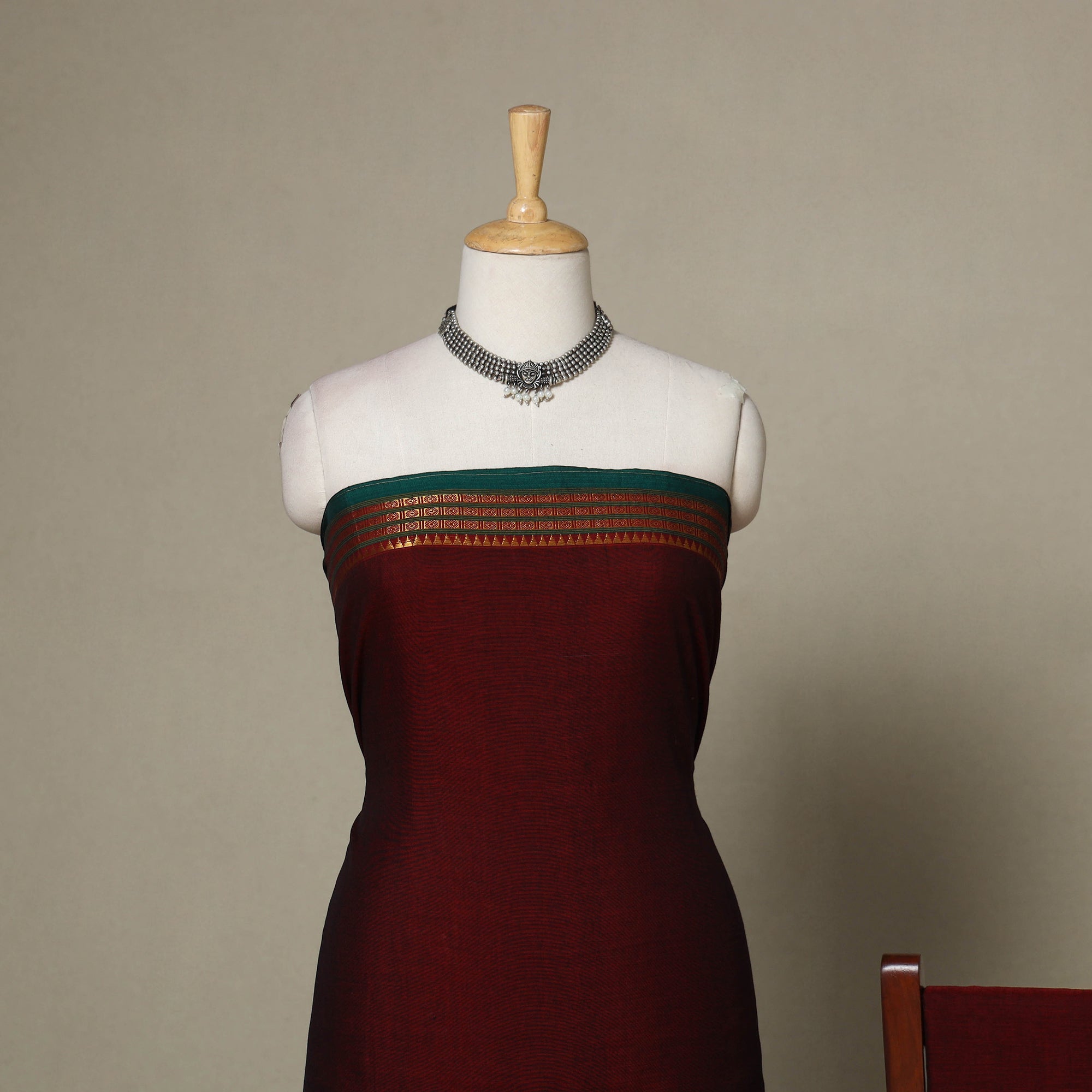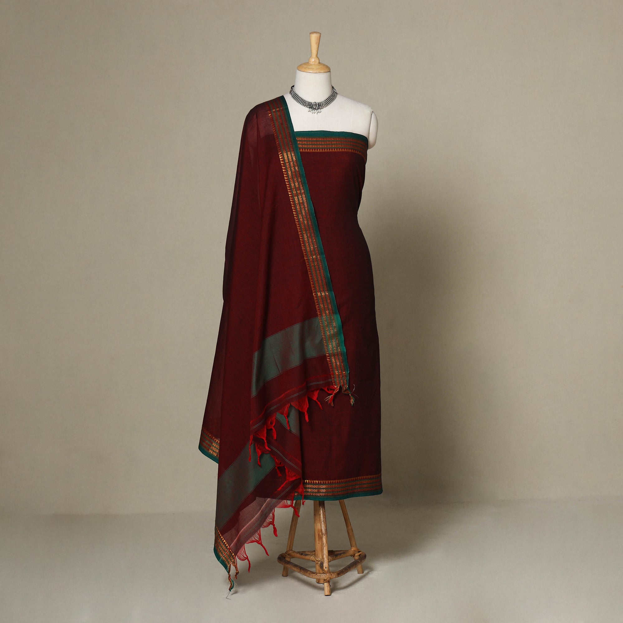 Experience the grace of dharwad with this elegant maroon 3pc cotton dress material set. It includes a kurta, bottom, and dupatta, adorned with traditional woven border detailing, a signature of dharwad's timeless weaving heritage from Karnataka. Soft, breathable, and versatile, it's perfect for both festive occasions and everyday elegance.