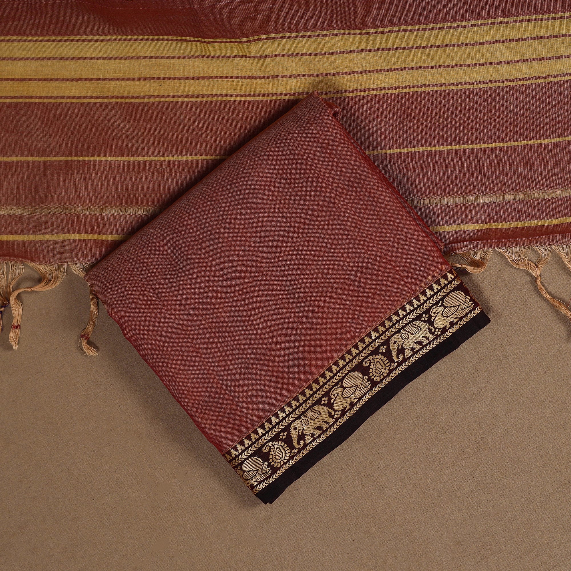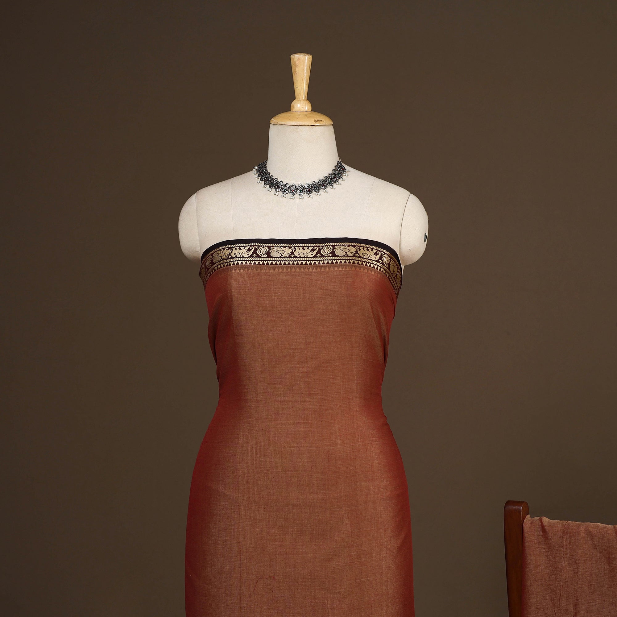 Brown 3pc cotton dress material set from Dharwad, Karnataka. This set is a tribute to the rich textile heritage of the region, featuring traditional woven border work that adds a touch of sophistication. The set includes a beautifully crafted kurta piece, a matching bottom/salwar piece and a coordinating dupatta. Made with care, it offers both comfort and elegance, perfect for festive occasions or casual gatherings.
