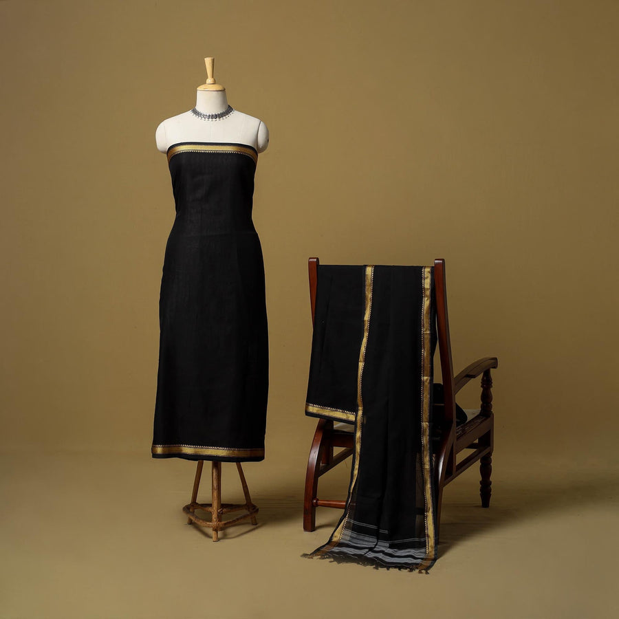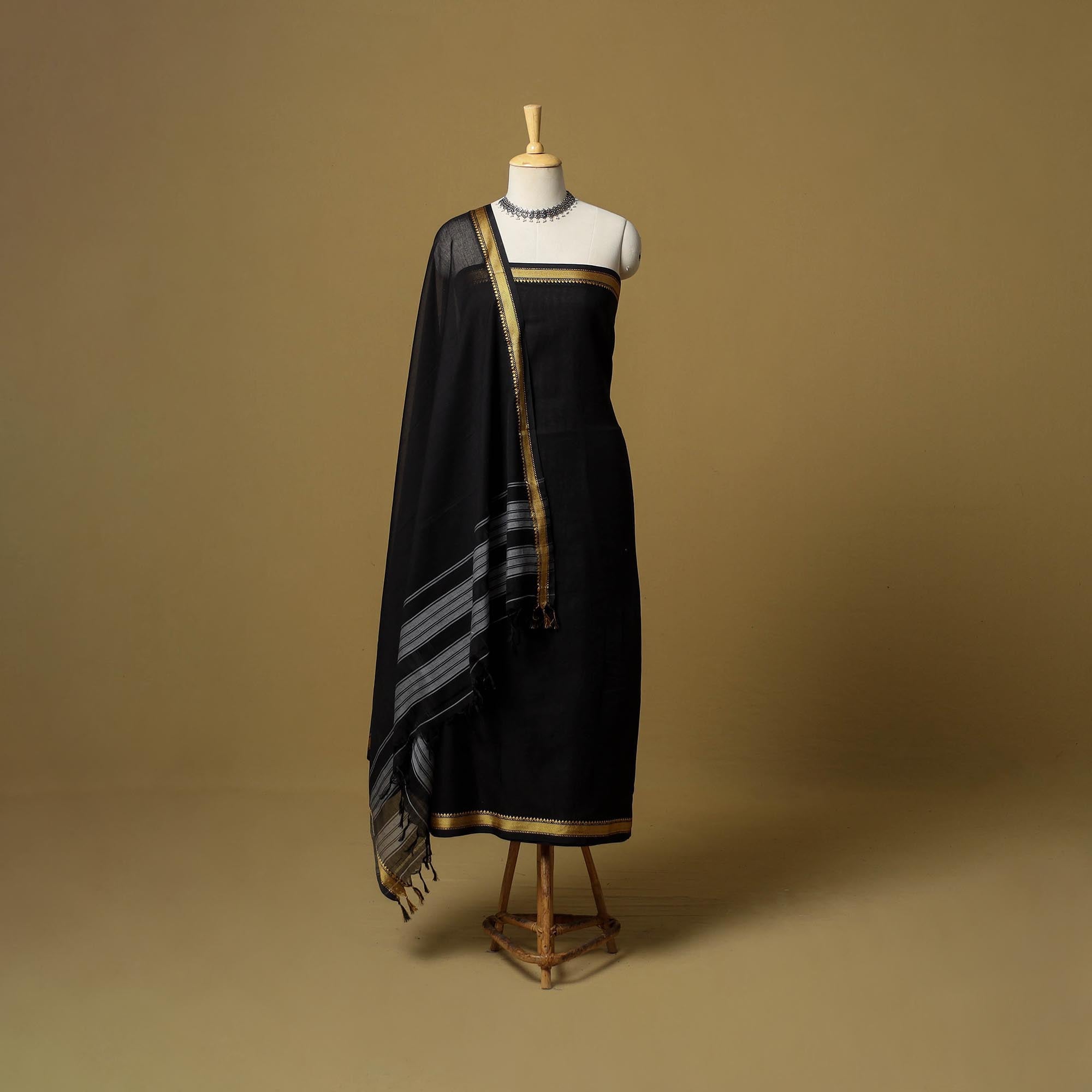 Black 3pc cotton dress material set from Dharwad, Karnataka. This set is a tribute to the rich textile heritage of the region, featuring traditional woven border work that adds a touch of sophistication. The set includes a beautifully crafted kurta piece, a matching bottom/salwar piece and a coordinating dupatta. Made with care, it offers both comfort and elegance, perfect for festive occasions or casual gatherings.