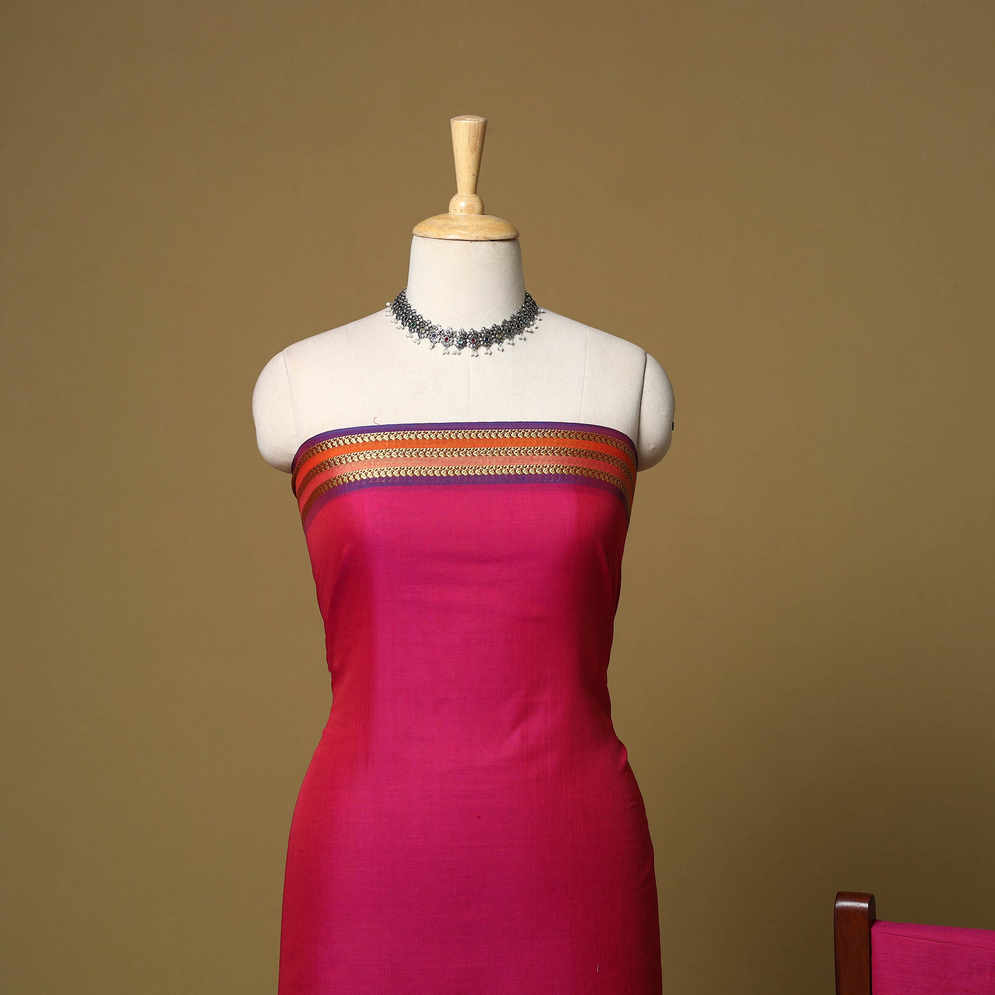 Pink 3pc cotton dress material set with traditional woven border from Dharwad, Karnataka. The set includes a beautifully crafted kurta piece, a matching bottom/salwar piece and a coordinating dupatta. Perfect for festive occasions or casual gatherings.