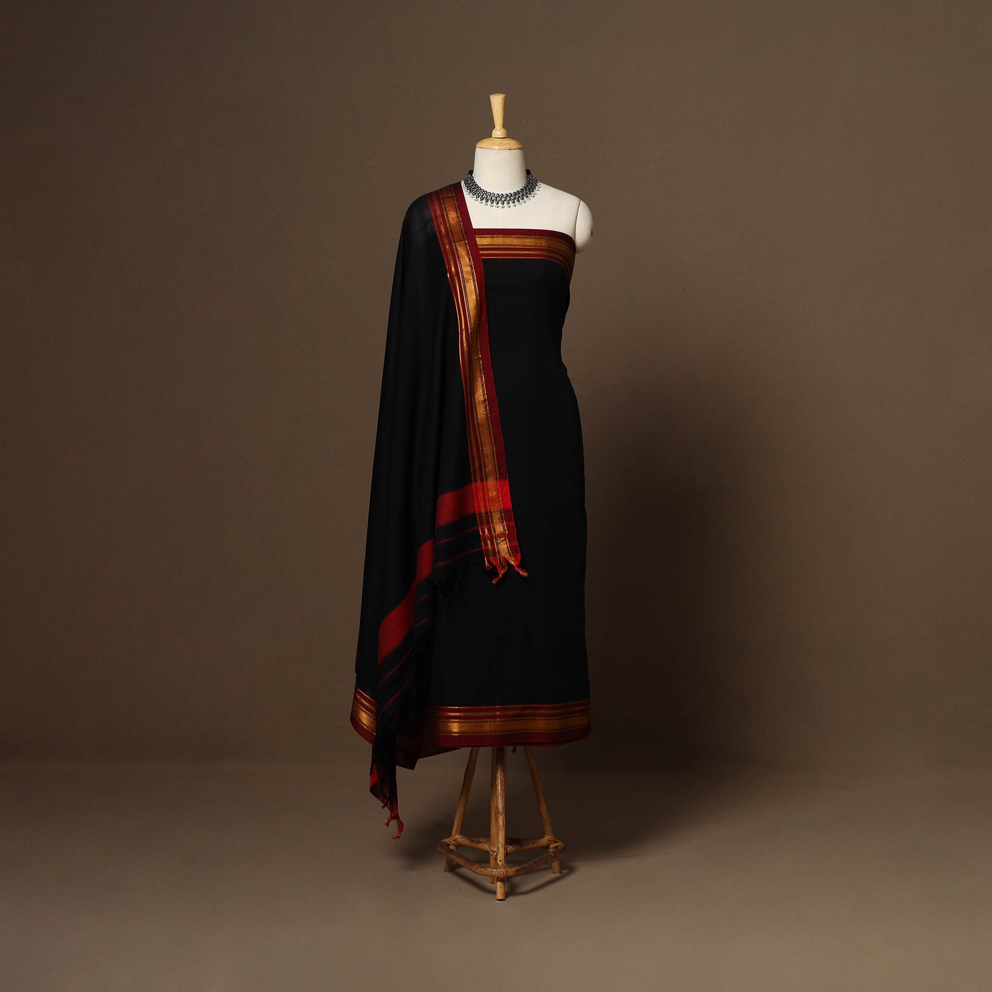 Black 3pc cotton dress material set from Dharwad, Karnataka. This set is a tribute to the rich textile heritage of the region, featuring traditional woven border work that adds a touch of sophistication. The set includes a beautifully crafted kurta piece, a matching bottom/salwar piece, and a coordinating dupatta. Crafted with precision and care, this suit material set offers both style and comfort. Whether you're attending a festive occasion or a casual gathering, this ensemble is sure to make a lasting impression.