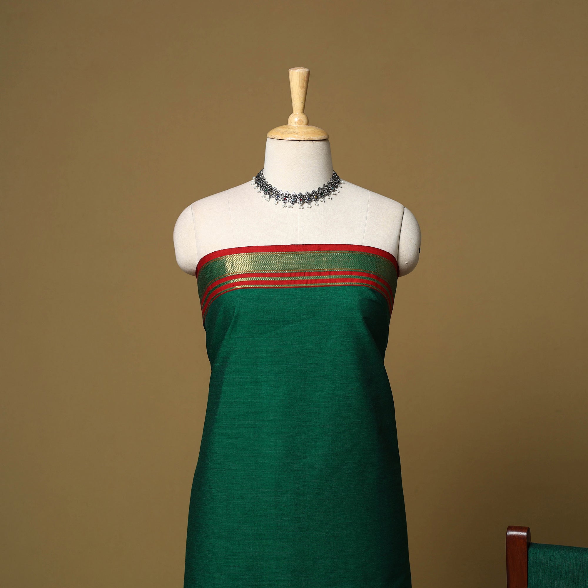 Green 3pc cotton dress material set with traditional woven border from Dharwad, Karnataka. The set includes a beautifully crafted kurta piece, a matching bottom/salwar piece and a coordinating dupatta. Perfect for festive occasions or casual gatherings.