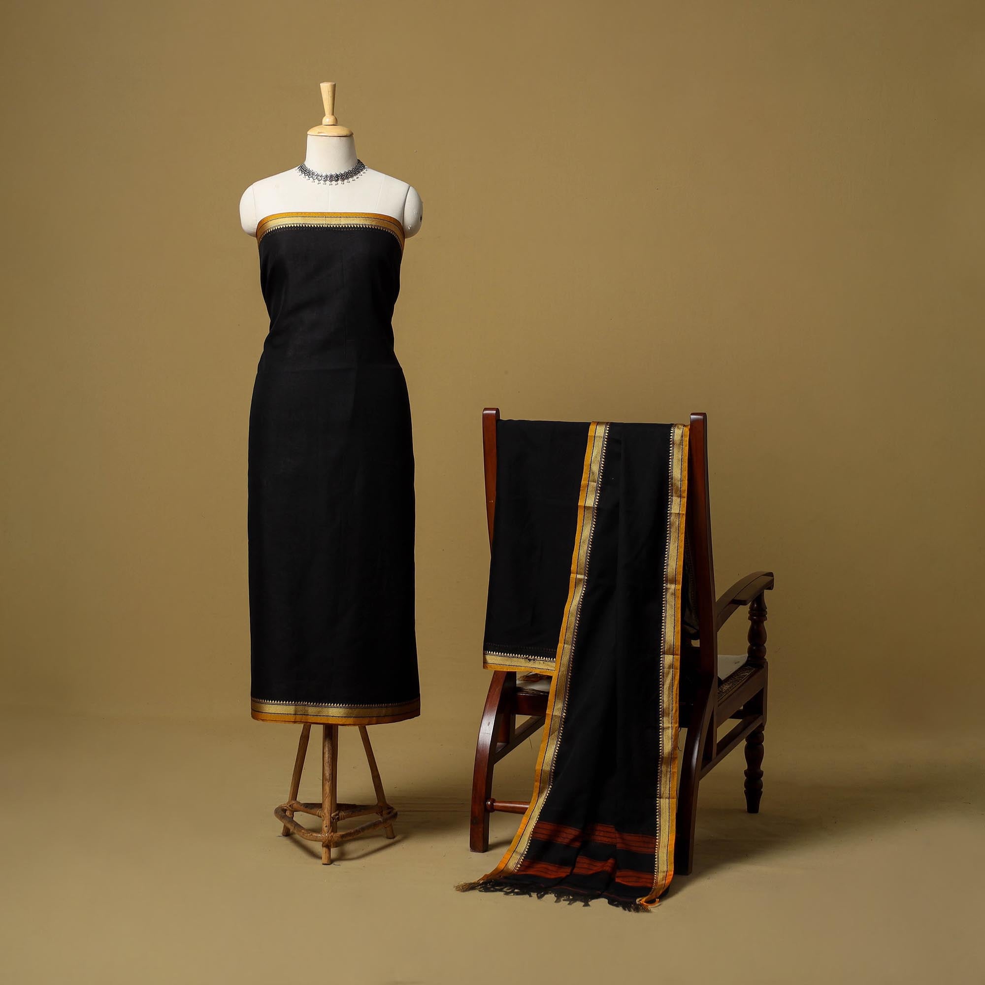 Black 3pc cotton dress material set from Dharwad, Karnataka. This set is a tribute to the rich textile heritage of the region, featuring traditional woven border work that adds a touch of sophistication. The set includes a beautifully crafted kurta piece, a matching bottom/salwar piece and a coordinating dupatta. Made with care, it offers both comfort and elegance, perfect for festive occasions or casual gatherings.