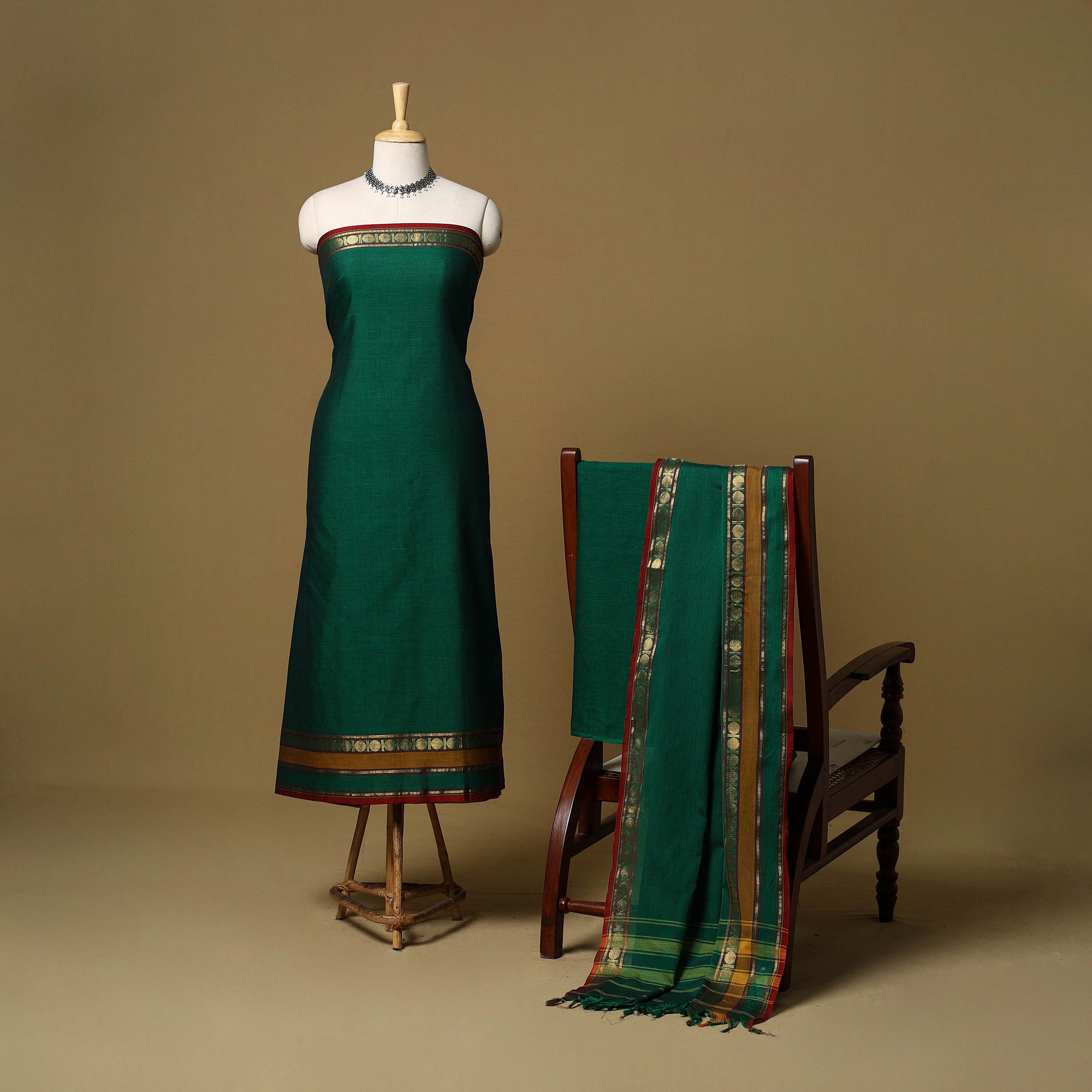 Green 3pc cotton dress material set with traditional woven border from Dharwad, Karnataka. The set includes a beautifully crafted kurta piece, a matching bottom/salwar piece and a coordinating dupatta. Perfect for festive occasions or casual gatherings.
