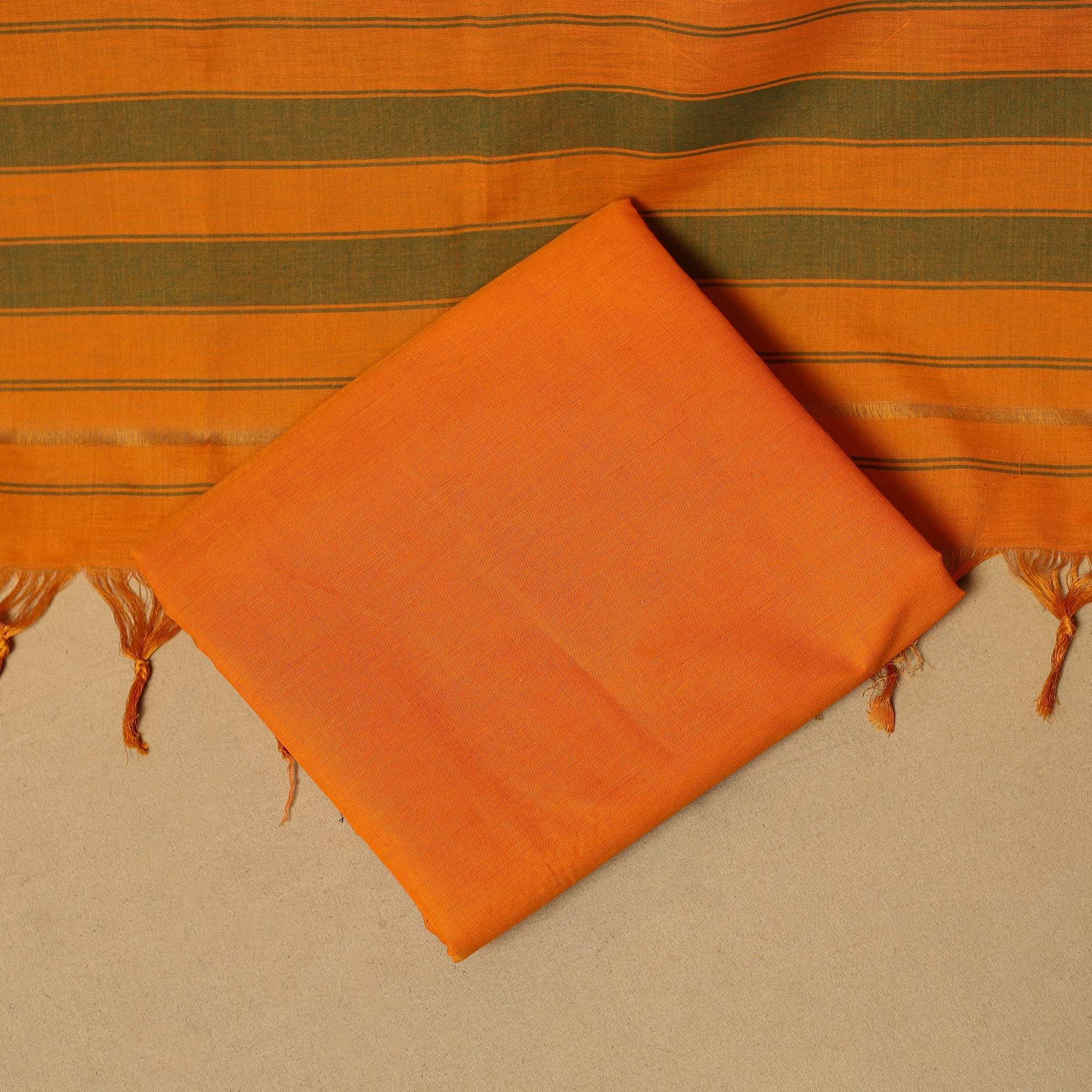 Orange 3pc cotton dress material set with traditional woven border from Dharwad, Karnataka. The set includes a beautifully crafted kurta piece, a matching bottom/salwar piece and a coordinating dupatta. Perfect for festive occasions or casual gatherings.