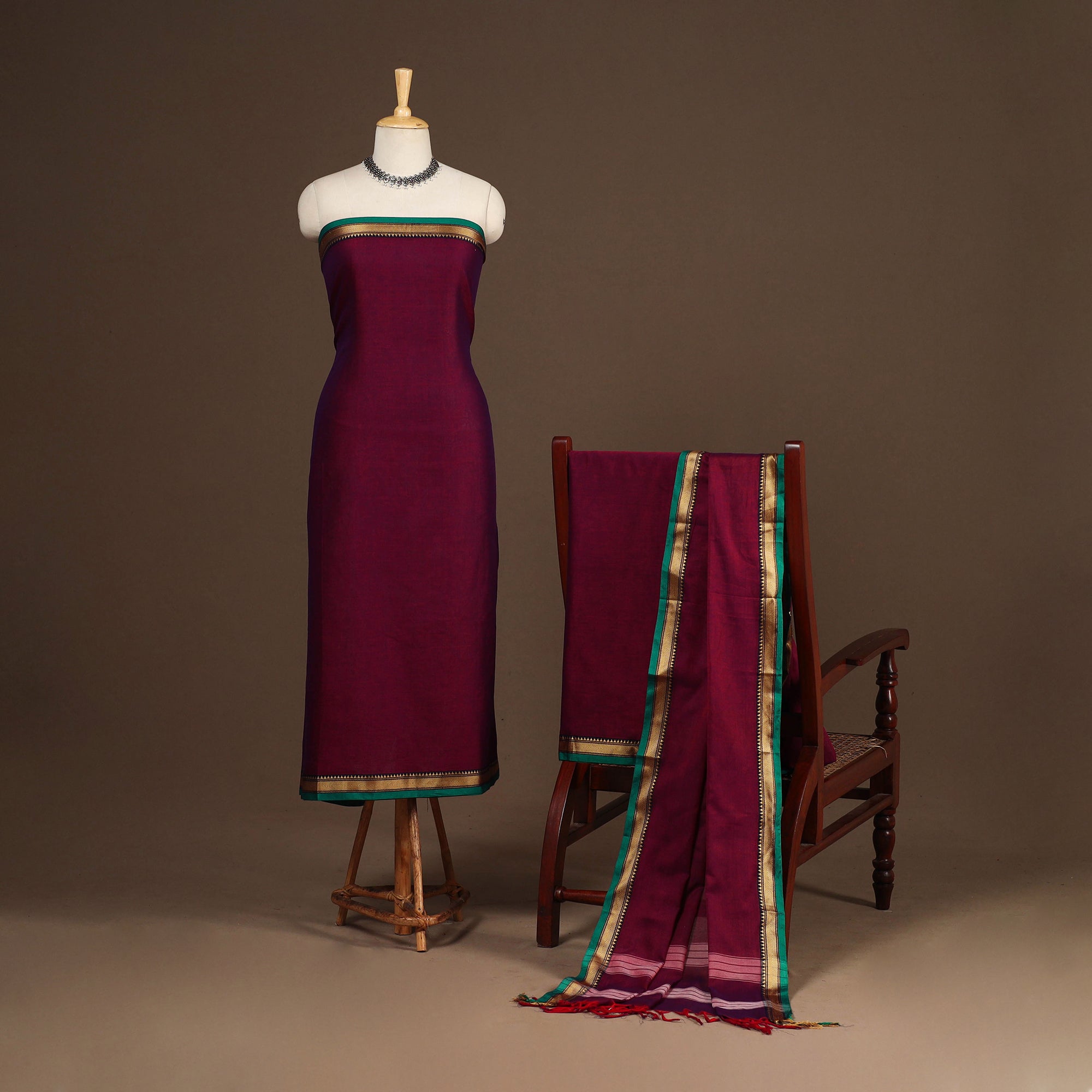 Maroon 3pc cotton dress material set from Dharwad, Karnataka. This set is a tribute to the rich textile heritage of the region, featuring traditional woven border work that adds a touch of sophistication. The set includes a beautifully crafted kurta piece, a matching bottom/salwar piece and a coordinating dupatta. Made with care, it offers both comfort and elegance, perfect for festive occasions or casual gatherings.