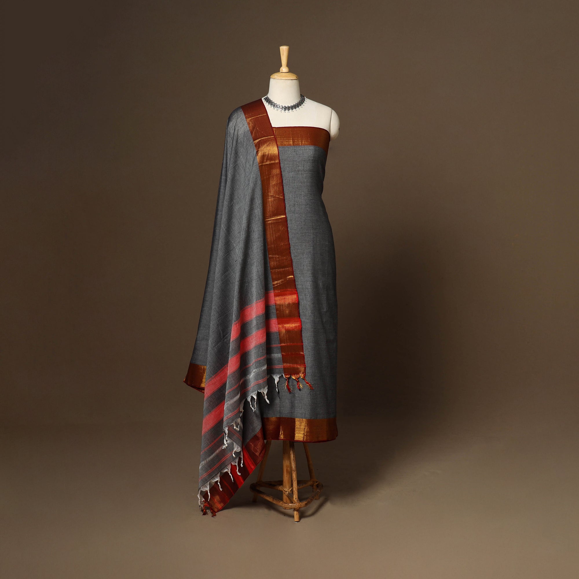 Grey 3pc cotton dress material set from Dharwad, Karnataka. This set is a tribute to the rich textile heritage of the region, featuring traditional woven border work that adds a touch of sophistication. The set includes a beautifully crafted kurta piece, a matching bottom/salwar piece, and a coordinating dupatta. Crafted with precision and care, this suit material set offers both style and comfort. Whether you're attending a festive occasion or a casual gathering, this ensemble is sure to make a lasting impression.