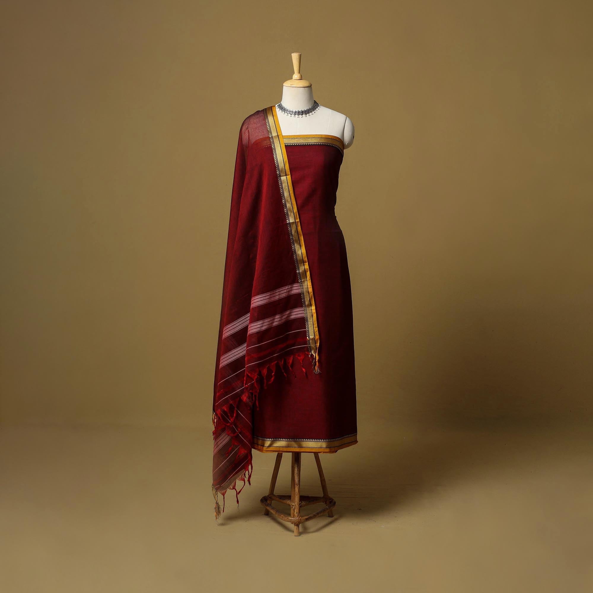 3pc cotton dress material set from Dharwad, Karnataka. This set is a tribute to the rich textile heritage of the region, featuring traditional woven border work that adds a touch of sophistication. The set includes a beautifully crafted kurta piece, a matching bottom/salwar piece and a coordinating dupatta. Made with care, it offers both comfort and elegance, perfect for festive occasions or casual gatherings.