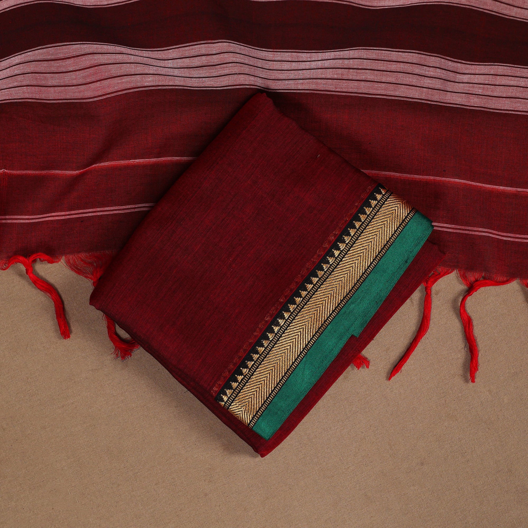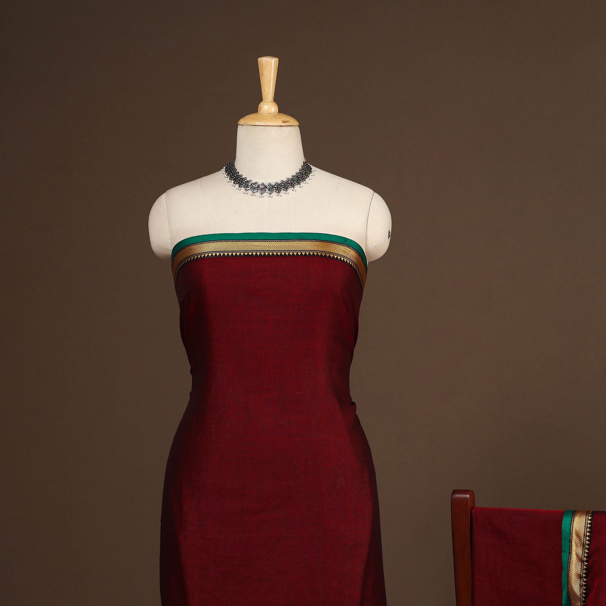 Maroon 3pc cotton dress material set from Dharwad, Karnataka. This set is a tribute to the rich textile heritage of the region, featuring traditional woven border work that adds a touch of sophistication. The set includes a beautifully crafted kurta piece, a matching bottom/salwar piece and a coordinating dupatta. Made with care, it offers both comfort and elegance, perfect for festive occasions or casual gatherings.