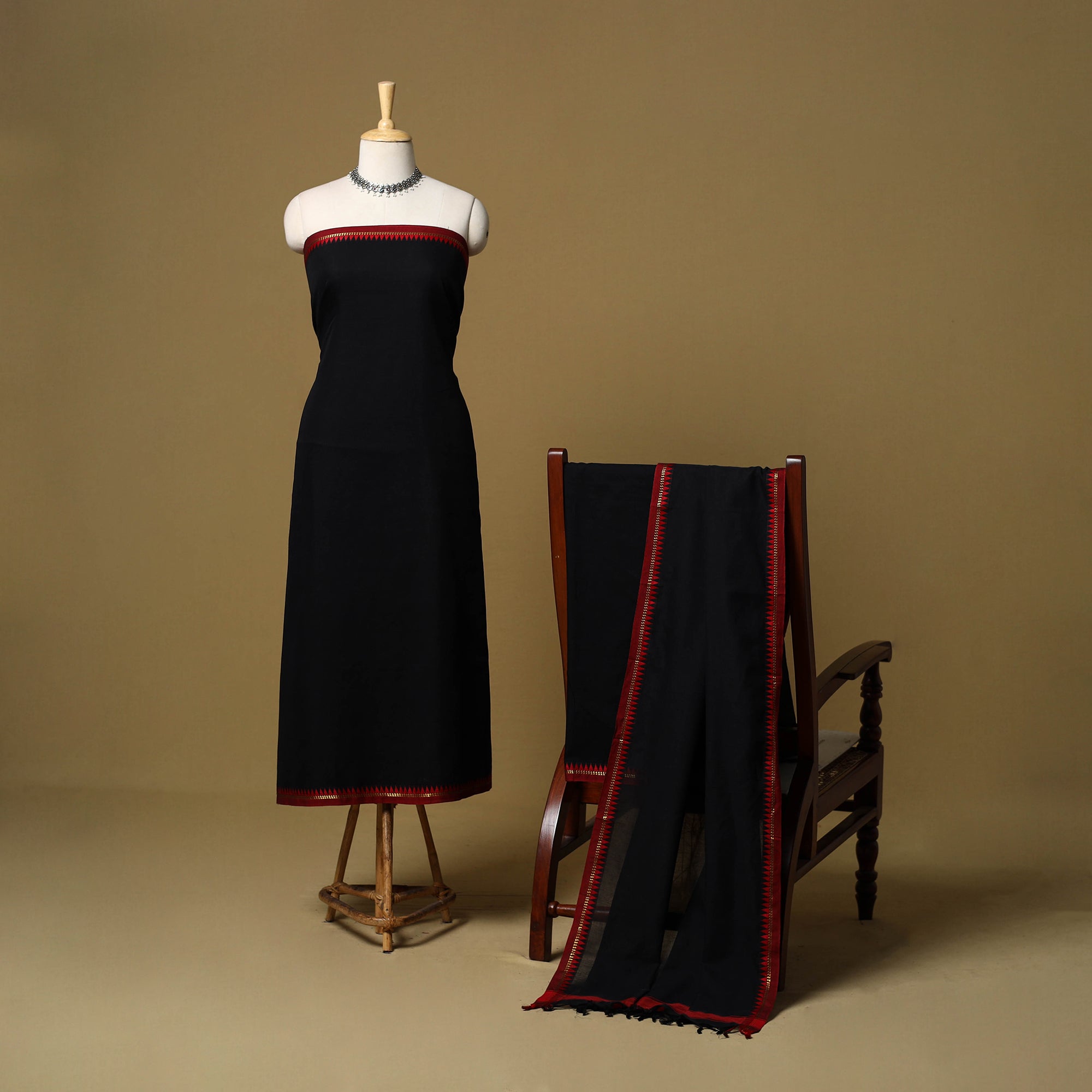 Black 3pc cotton dress material set with traditional woven border from Dharwad, Karnataka. The set includes a beautifully crafted kurta piece, a matching bottom/salwar piece and a coordinating dupatta. Perfect for festive occasions or casual gatherings.