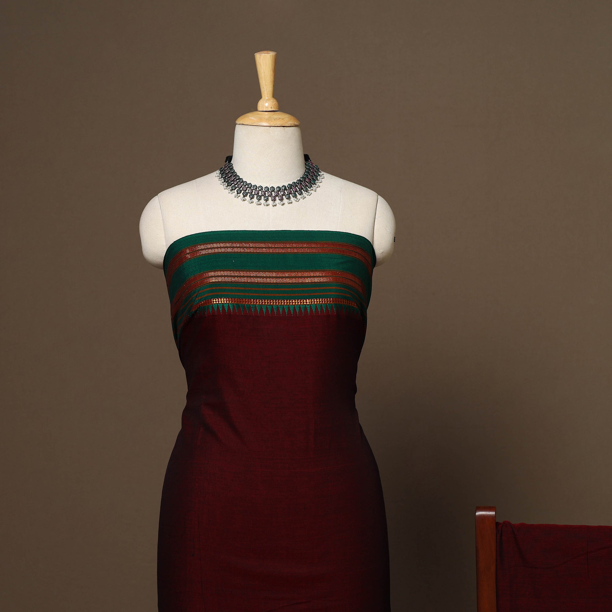 Maroon 3pc cotton dress material set from Dharwad, Karnataka. This set is a tribute to the rich textile heritage of the region, featuring traditional woven border work that adds a touch of sophistication. The set includes a beautifully crafted kurta piece, a matching bottom/salwar piece, and a coordinating dupatta. Crafted with precision and care, this suit material set offers both style and comfort. Whether you're attending a festive occasion or a casual gathering, this ensemble is sure to make a lasting impression.
