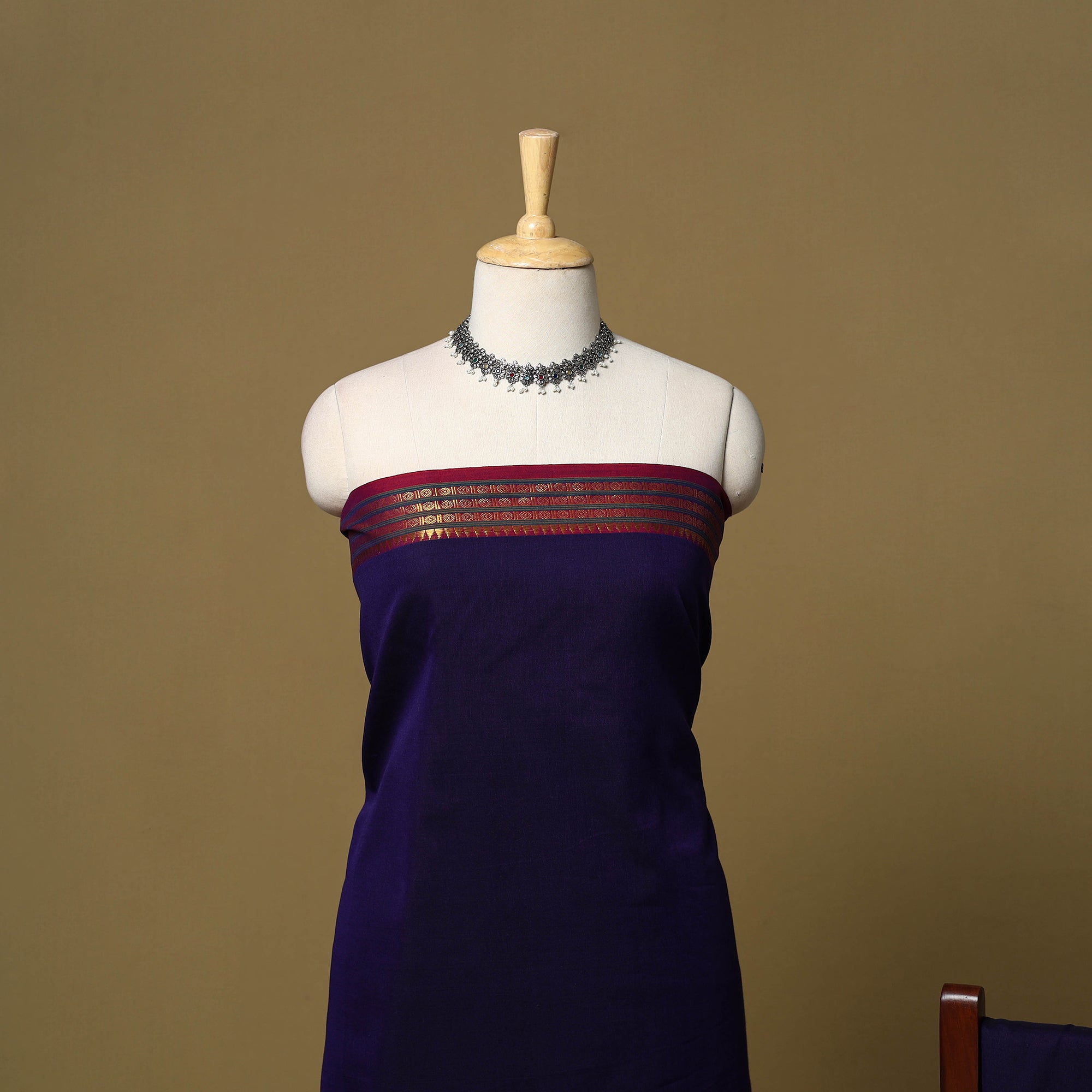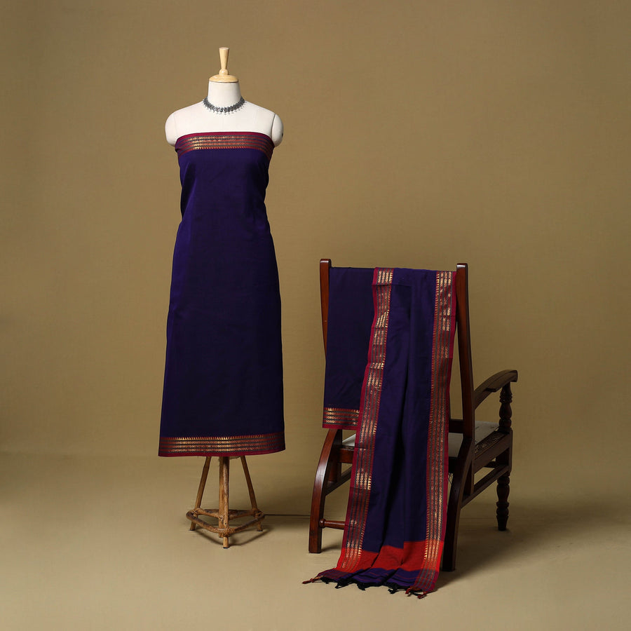 Purple 3pc cotton dress material set with traditional woven border from Dharwad, Karnataka. The set includes a beautifully crafted kurta piece, a matching bottom/salwar piece and a coordinating dupatta. Perfect for festive occasions or casual gatherings.