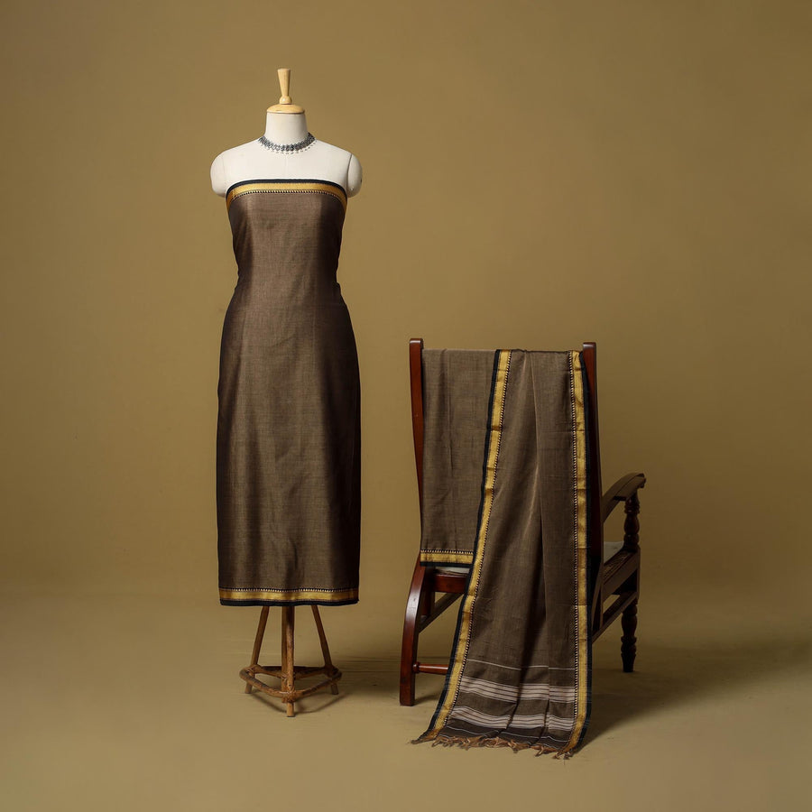 Brown 3pc cotton dress material set from Dharwad, Karnataka. This set is a tribute to the rich textile heritage of the region, featuring traditional woven border work that adds a touch of sophistication. The set includes a beautifully crafted kurta piece, a matching bottom/salwar piece and a coordinating dupatta. Made with care, it offers both comfort and elegance, perfect for festive occasions or casual gatherings.