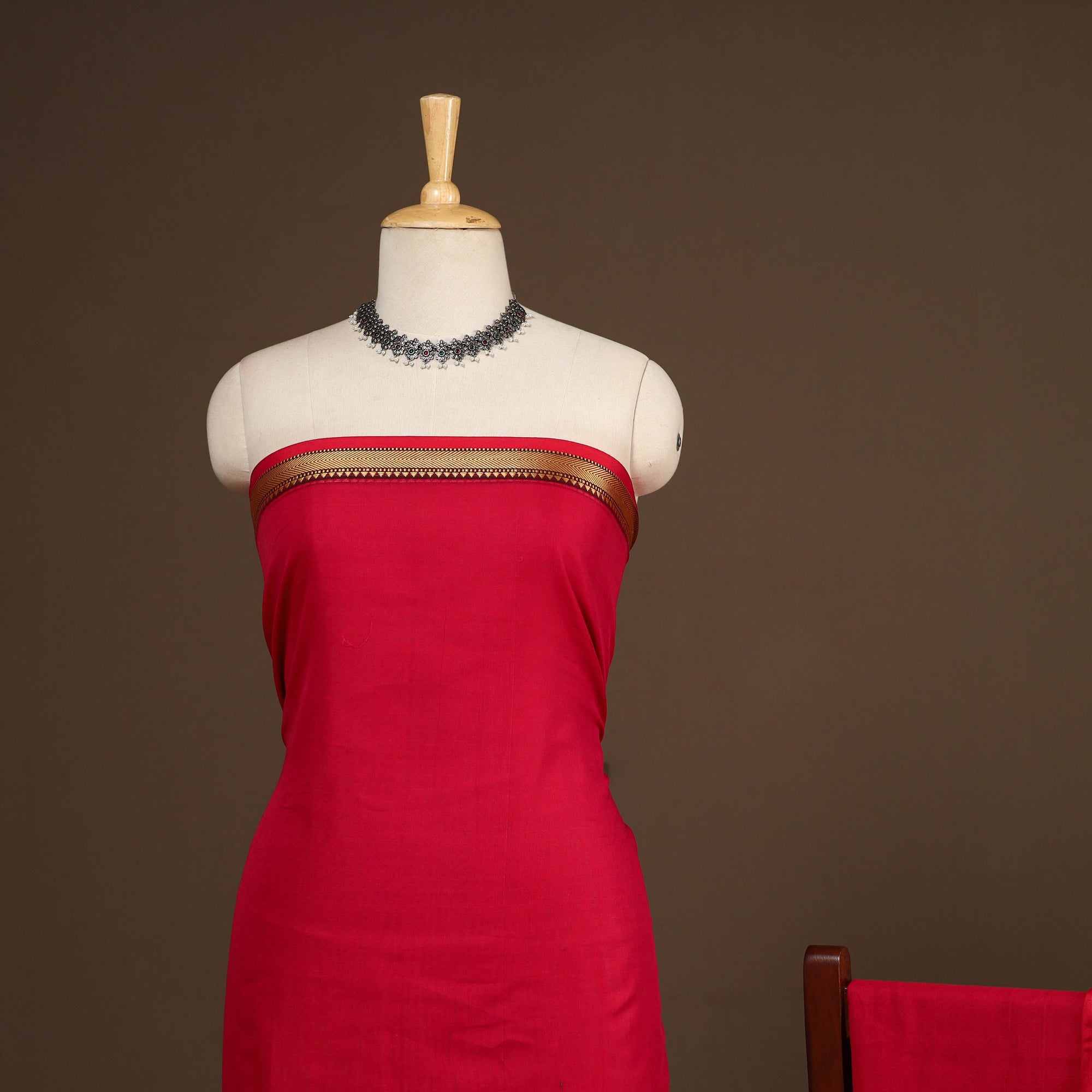 Red 3pc cotton dress material set from Dharwad, Karnataka. This set is a tribute to the rich textile heritage of the region, featuring traditional woven border work that adds a touch of sophistication. The set includes a beautifully crafted kurta piece, a matching bottom/salwar piece and a coordinating dupatta. Made with care, it offers both comfort and elegance, perfect for festive occasions or casual gatherings.