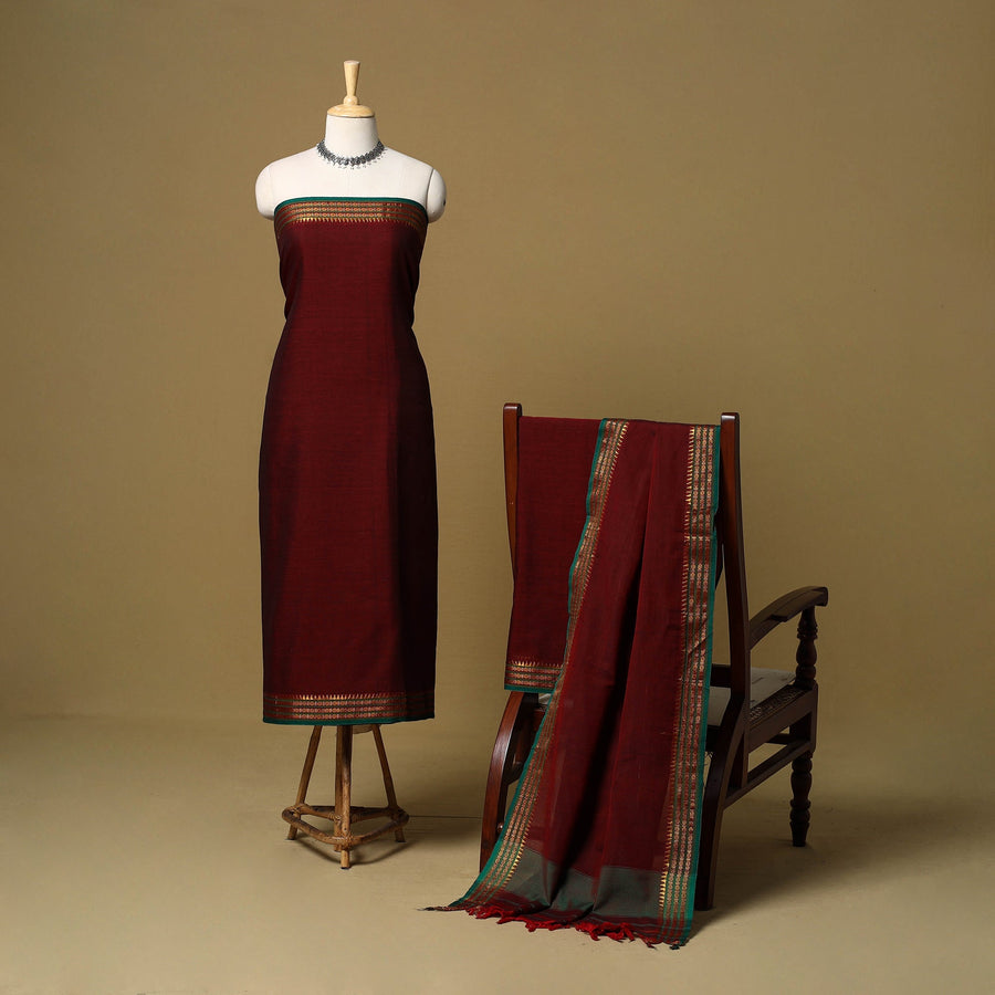 Maroon 3pc cotton dress material set with traditional woven border from Dharwad, Karnataka. The set includes a beautifully crafted kurta piece, a matching bottom/salwar piece and a coordinating dupatta. Perfect for festive occasions or casual gatherings.