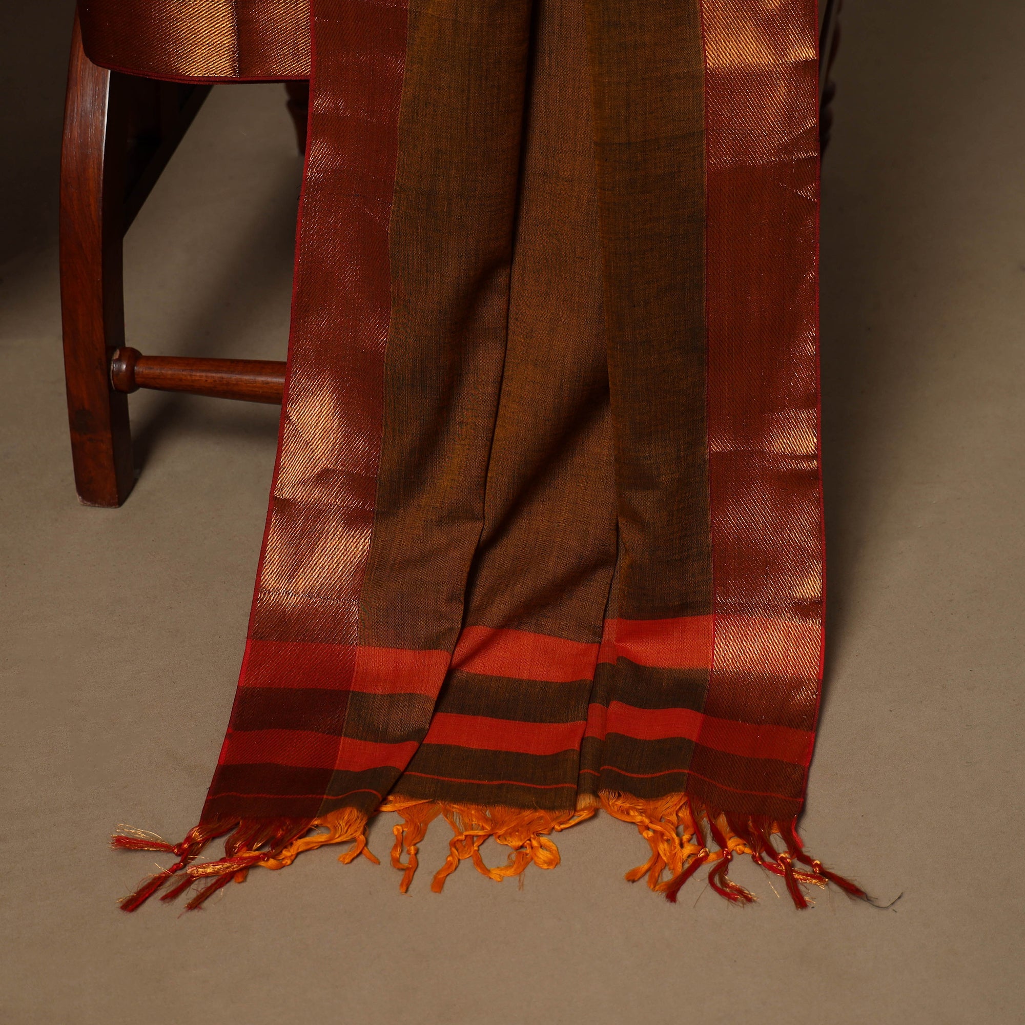 Brown 3pc cotton dress material set from Dharwad, Karnataka. This set is a tribute to the rich textile heritage of the region, featuring traditional woven border work that adds a touch of sophistication. The set includes a beautifully crafted kurta piece, a matching bottom/salwar piece, and a coordinating dupatta. Crafted with precision and care, this suit material set offers both style and comfort. Whether you're attending a festive occasion or a casual gathering, this ensemble is sure to make a lasting impression.