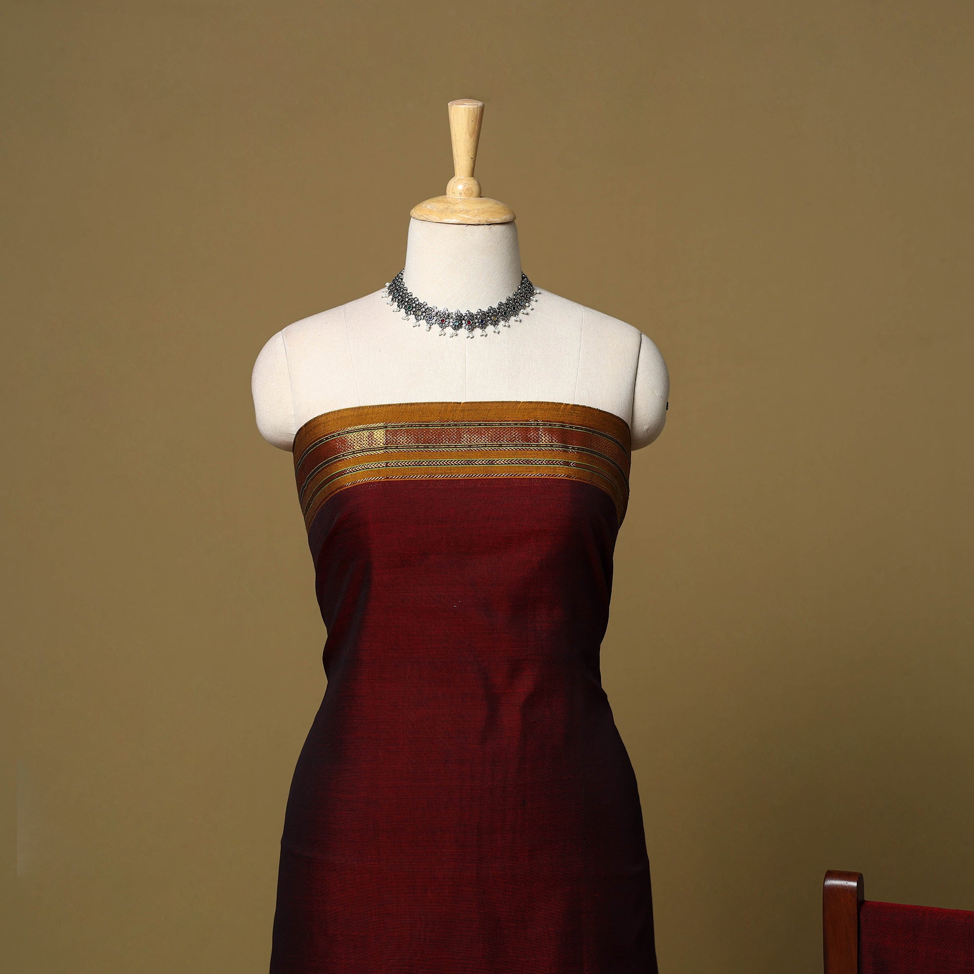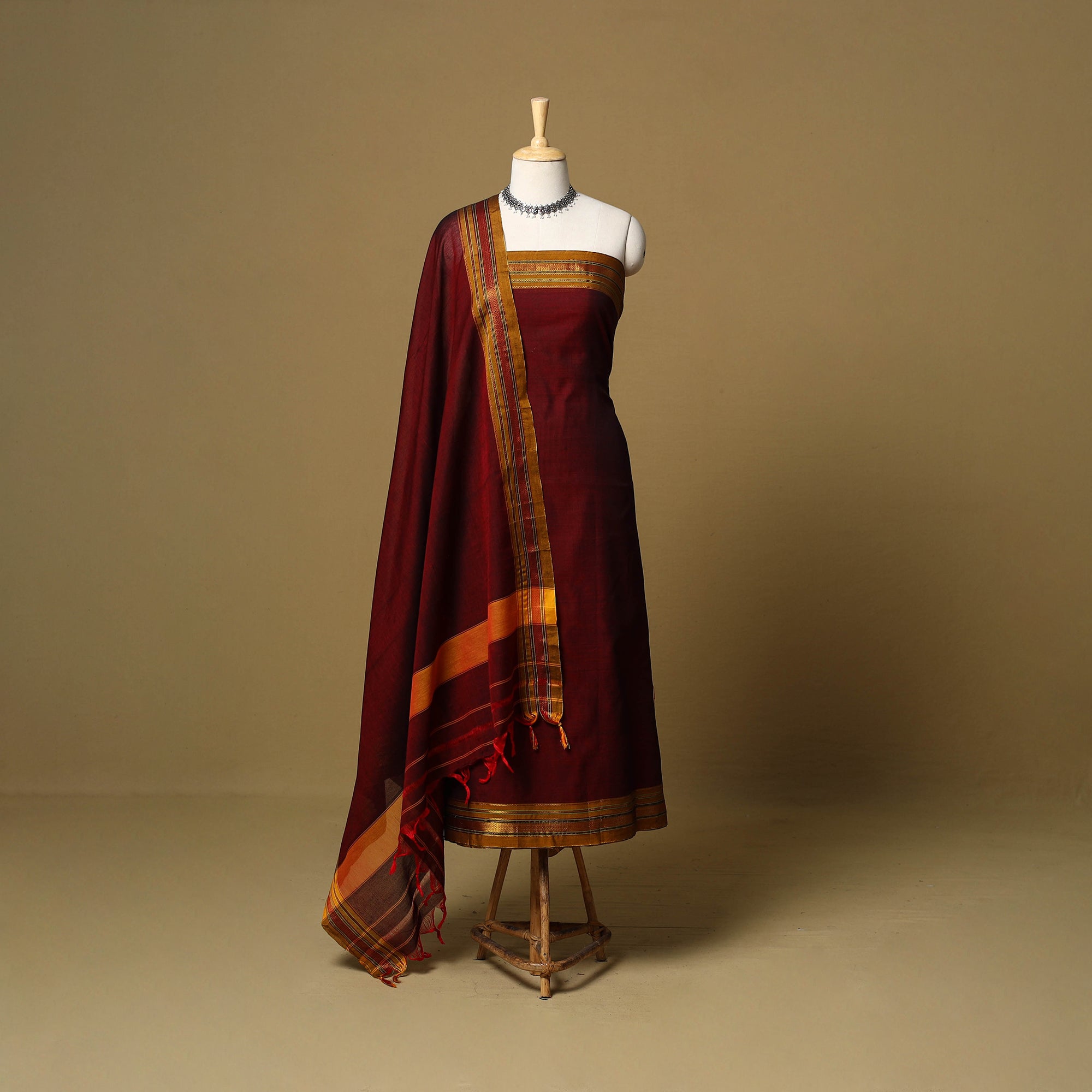 Maroon 3pc cotton dress material set with traditional woven border from Dharwad, Karnataka. The set includes a beautifully crafted kurta piece, a matching bottom/salwar piece and a coordinating dupatta. Perfect for festive occasions or casual gatherings.