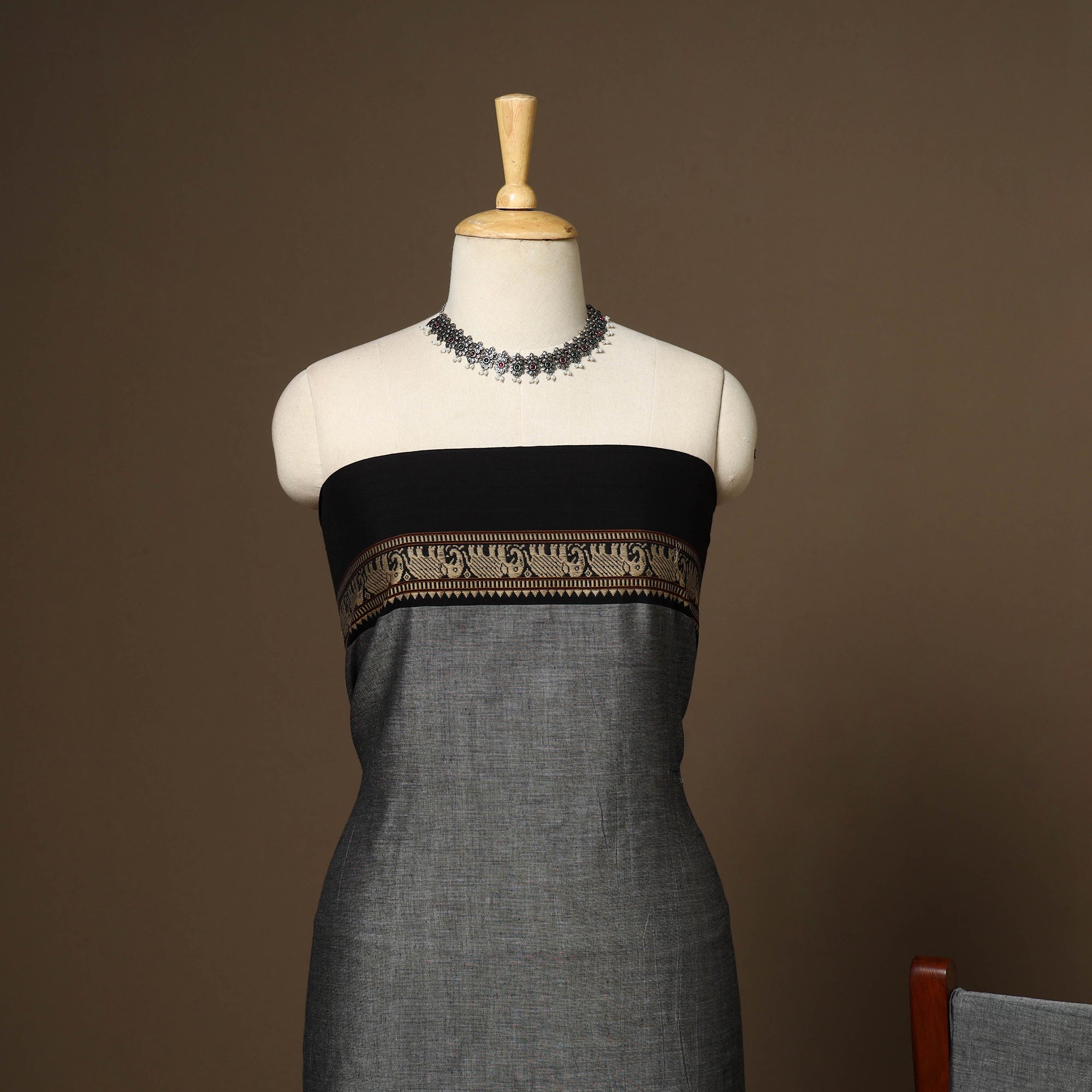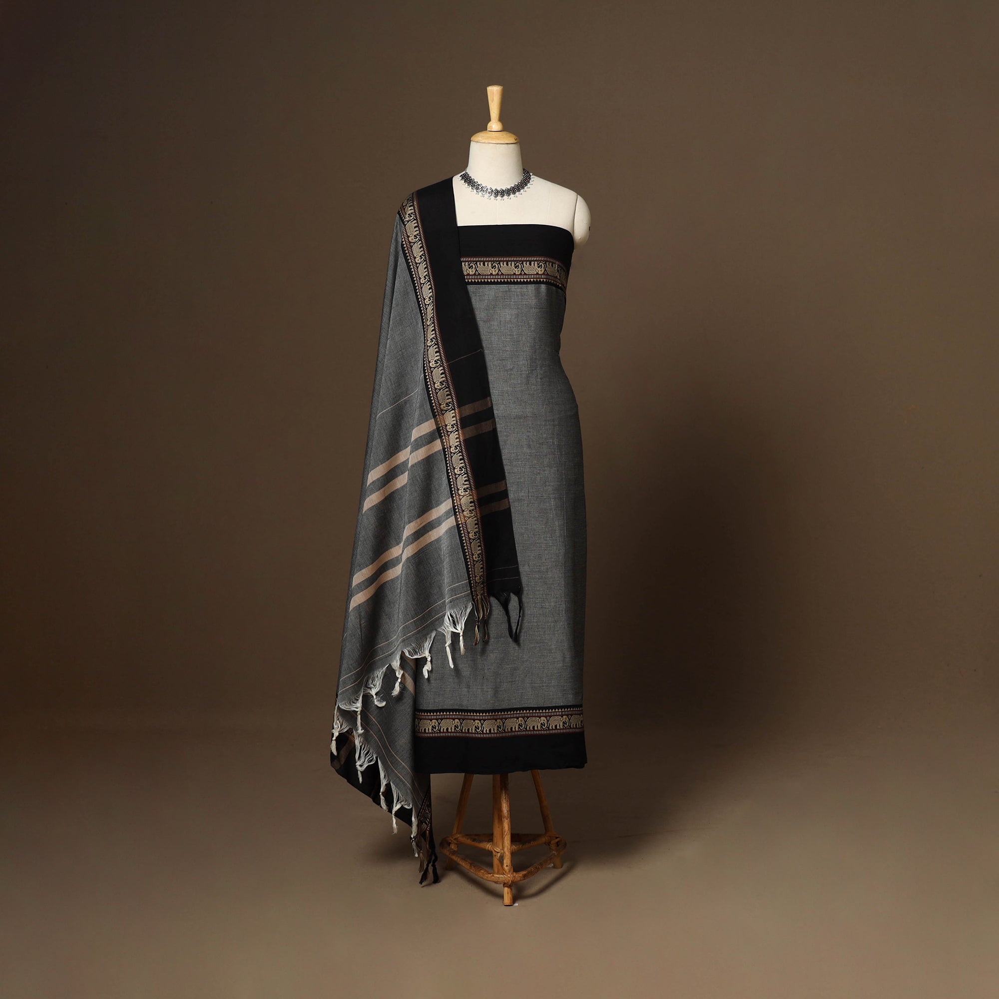 Grey 3pc cotton dress material set from Dharwad, Karnataka. This set is a tribute to the rich textile heritage of the region, featuring traditional woven border work that adds a touch of sophistication. The set includes a beautifully crafted kurta piece, a matching bottom/salwar piece, and a coordinating dupatta. Crafted with precision and care, this suit material set offers both style and comfort. Whether you're attending a festive occasion or a casual gathering, this ensemble is sure to make a lasting impression.