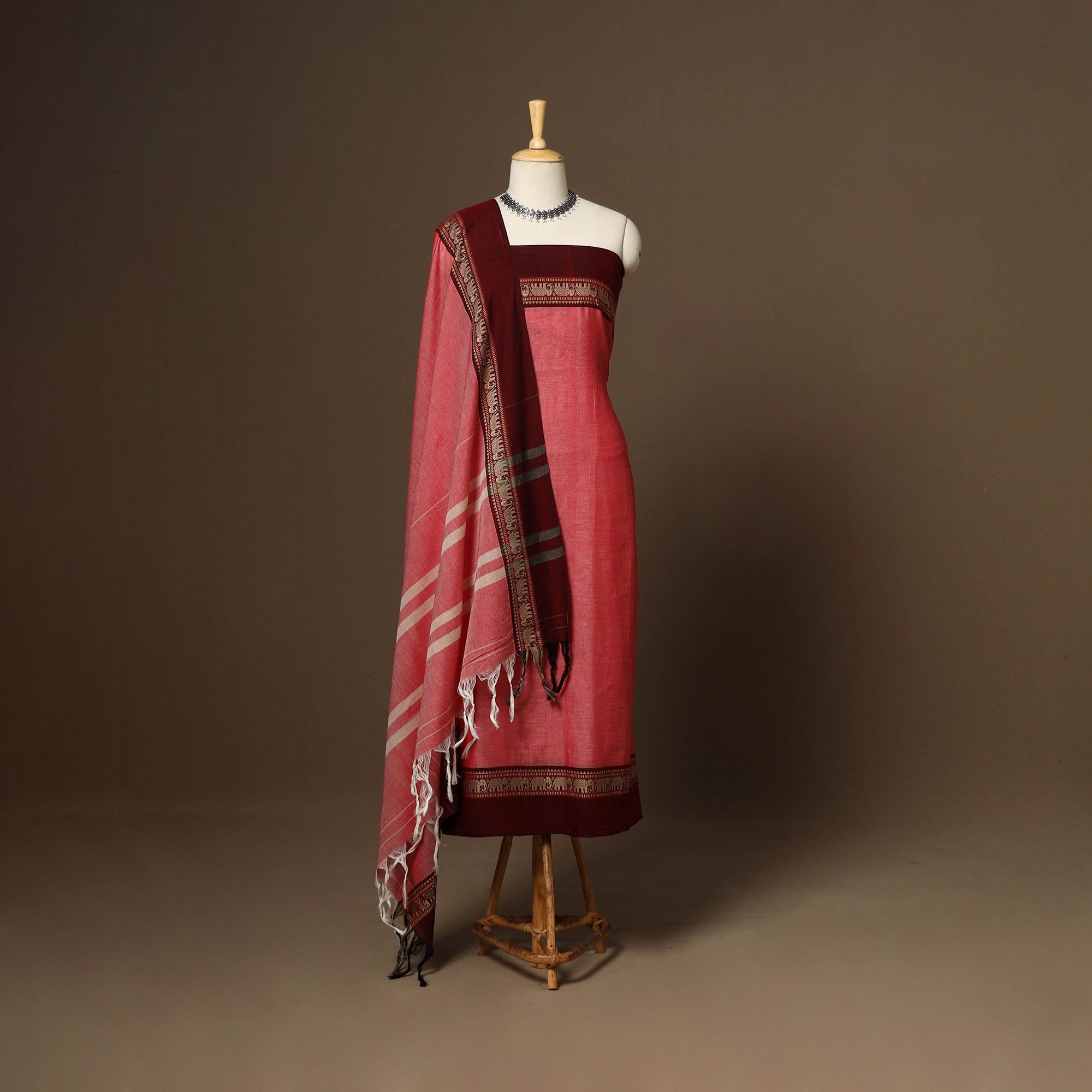 Pink 3pc cotton dress material set from Dharwad, Karnataka. This set is a tribute to the rich textile heritage of the region, featuring traditional woven border work that adds a touch of sophistication. The set includes a beautifully crafted kurta piece, a matching bottom/salwar piece, and a coordinating dupatta. Crafted with precision and care, this suit material set offers both style and comfort. Whether you're attending a festive occasion or a casual gathering, this ensemble is sure to make a lasting impression.