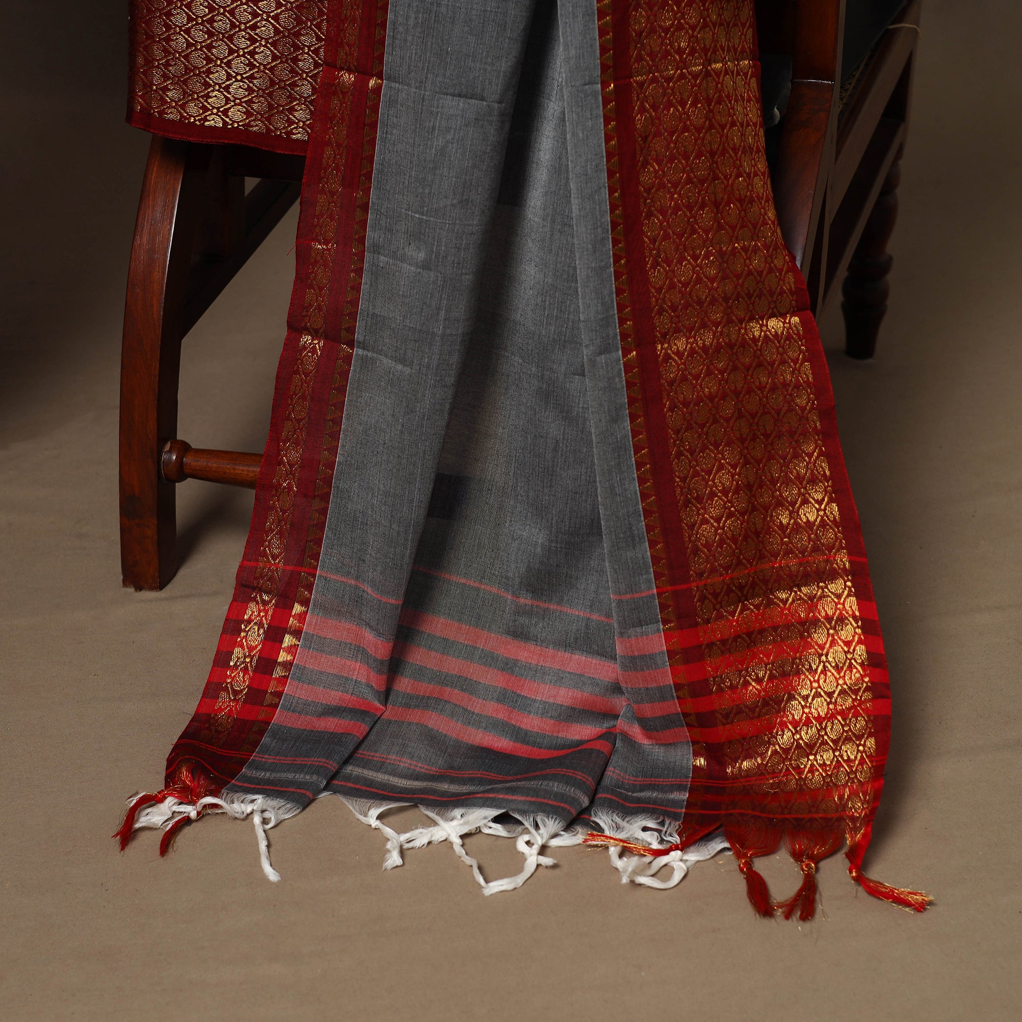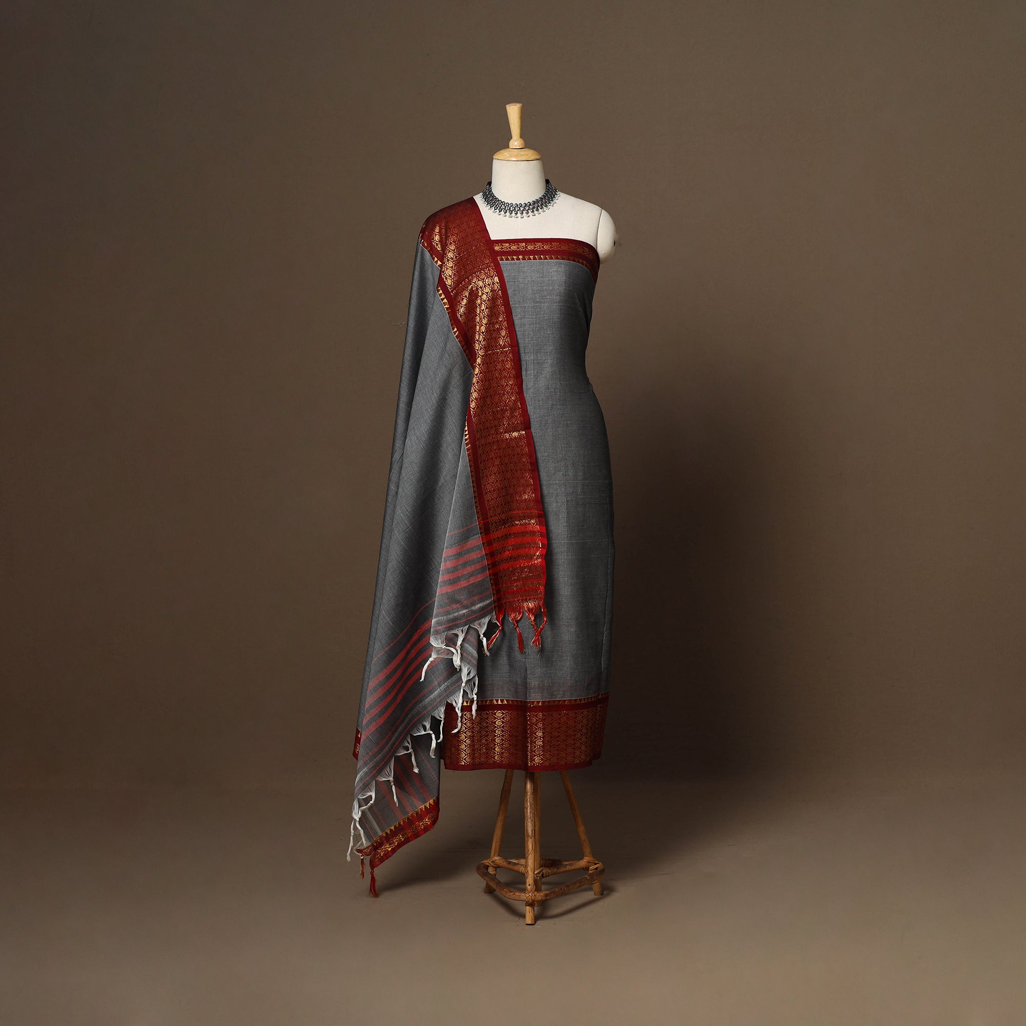 Grey 3pc cotton dress material set from Dharwad, Karnataka. This set is a tribute to the rich textile heritage of the region, featuring traditional woven border work that adds a touch of sophistication. The set includes a beautifully crafted kurta piece, a matching bottom/salwar piece, and a coordinating dupatta. Crafted with precision and care, this suit material set offers both style and comfort. Whether you're attending a festive occasion or a casual gathering, this ensemble is sure to make a lasting impression.