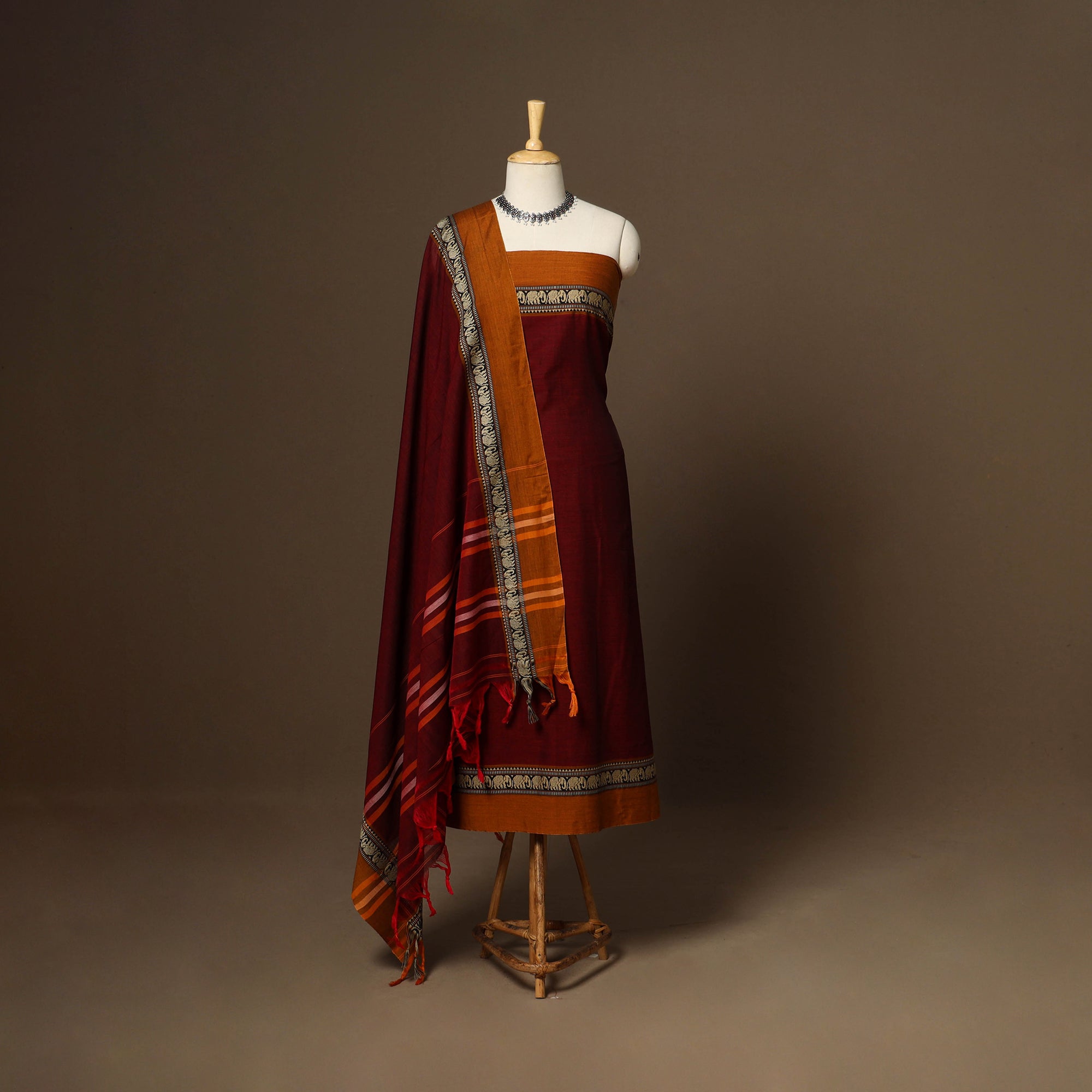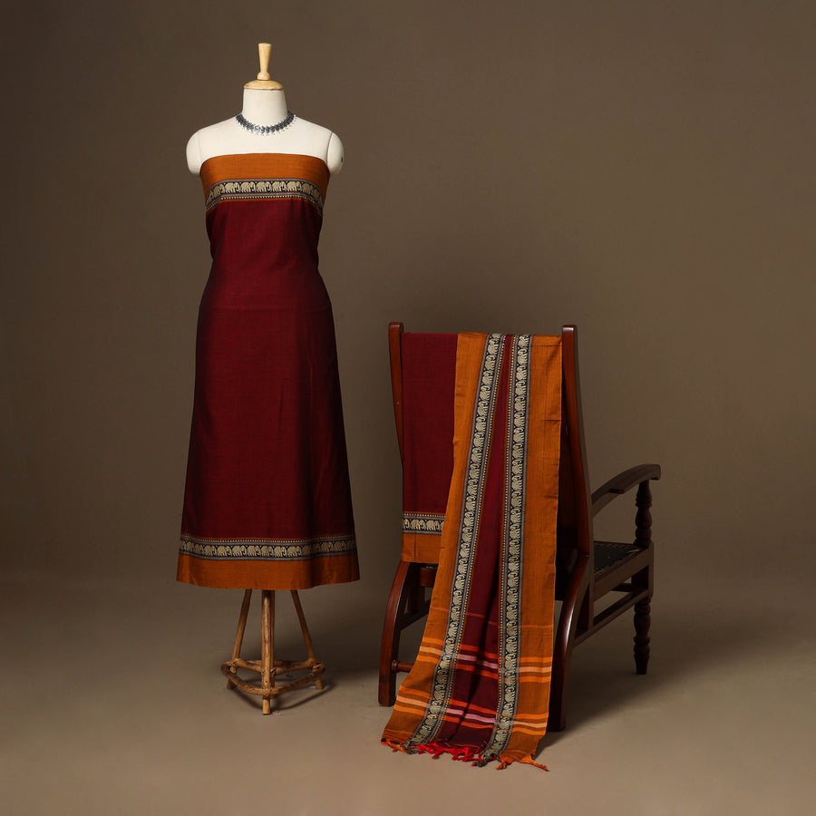 Maroon 3pc cotton dress material set from Dharwad, Karnataka. This set is a tribute to the rich textile heritage of the region, featuring traditional woven border work that adds a touch of sophistication. The set includes a beautifully crafted kurta piece, a matching bottom/salwar piece, and a coordinating dupatta. Crafted with precision and care, this suit material set offers both style and comfort. Whether you're attending a festive occasion or a casual gathering, this ensemble is sure to make a lasting impression.