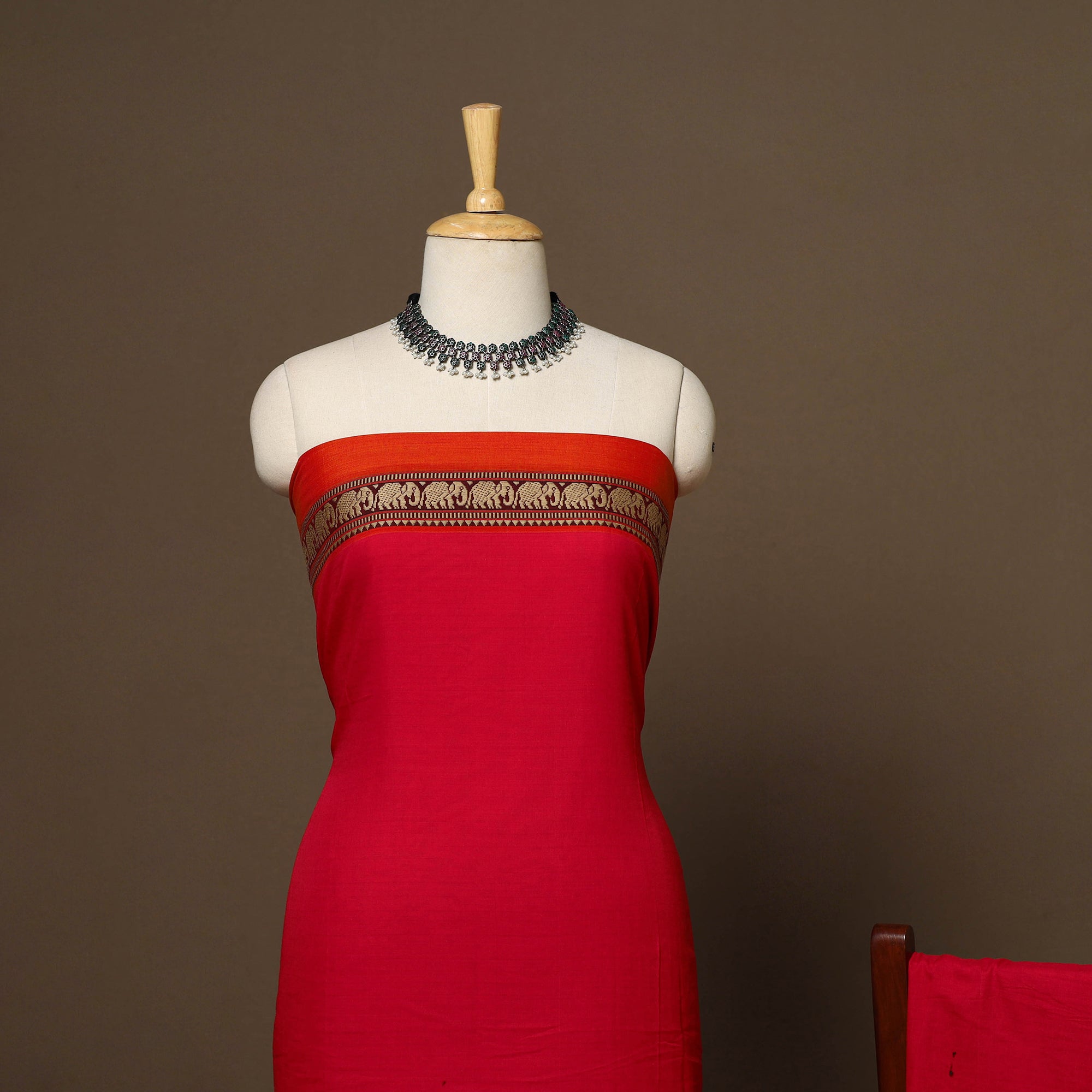 Red 3pc cotton dress material set from Dharwad, Karnataka. This set is a tribute to the rich textile heritage of the region, featuring traditional woven border work that adds a touch of sophistication. The set includes a beautifully crafted kurta piece, a matching bottom/salwar piece, and a coordinating dupatta. Crafted with precision and care, this suit material set offers both style and comfort. Whether you're attending a festive occasion or a casual gathering, this ensemble is sure to make a lasting impression.