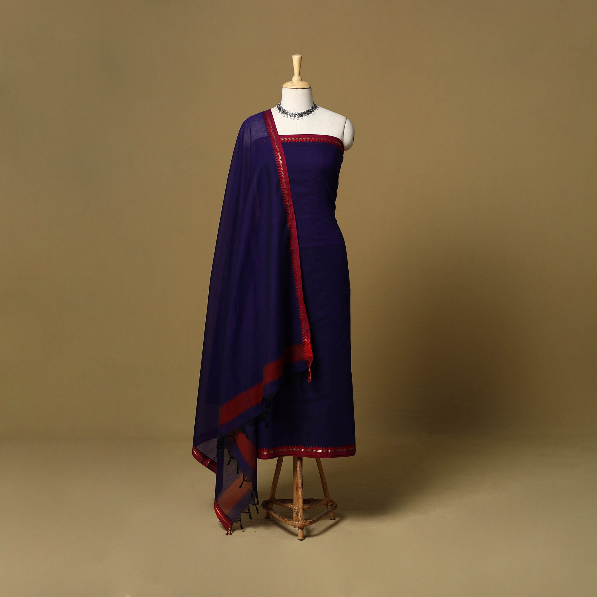 Purple 3pc cotton dress material set with traditional woven border from Dharwad, Karnataka. The set includes a beautifully crafted kurta piece, a matching bottom/salwar piece and a coordinating dupatta. Perfect for festive occasions or casual gatherings.