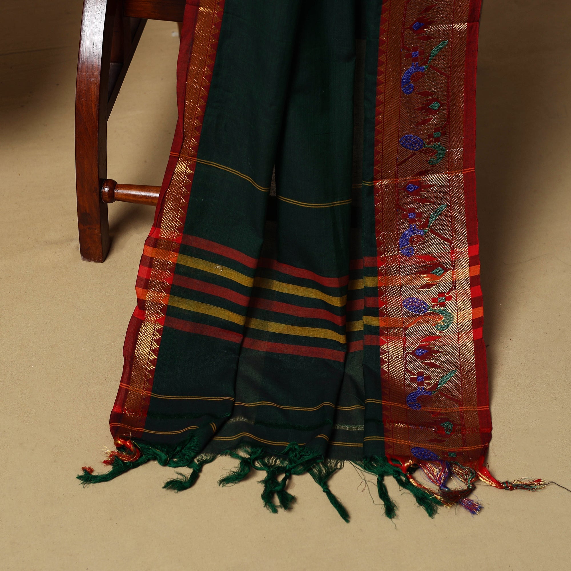 Green 3pc cotton dress material set with traditional woven border from Dharwad, Karnataka. The set includes a beautifully crafted kurta piece, a matching bottom/salwar piece and a coordinating dupatta. Perfect for festive occasions or casual gatherings.
