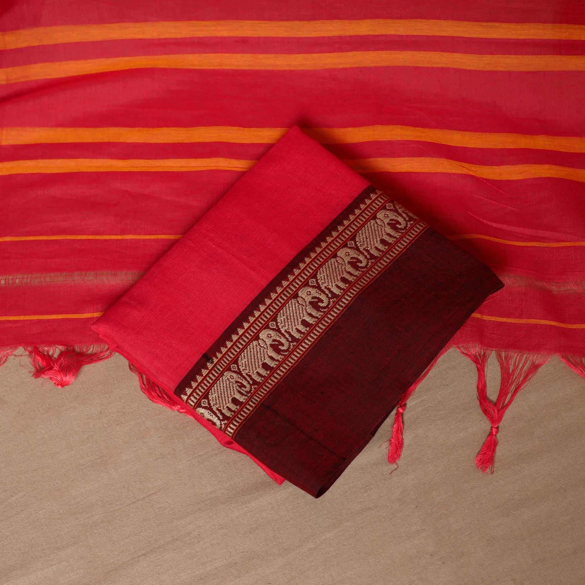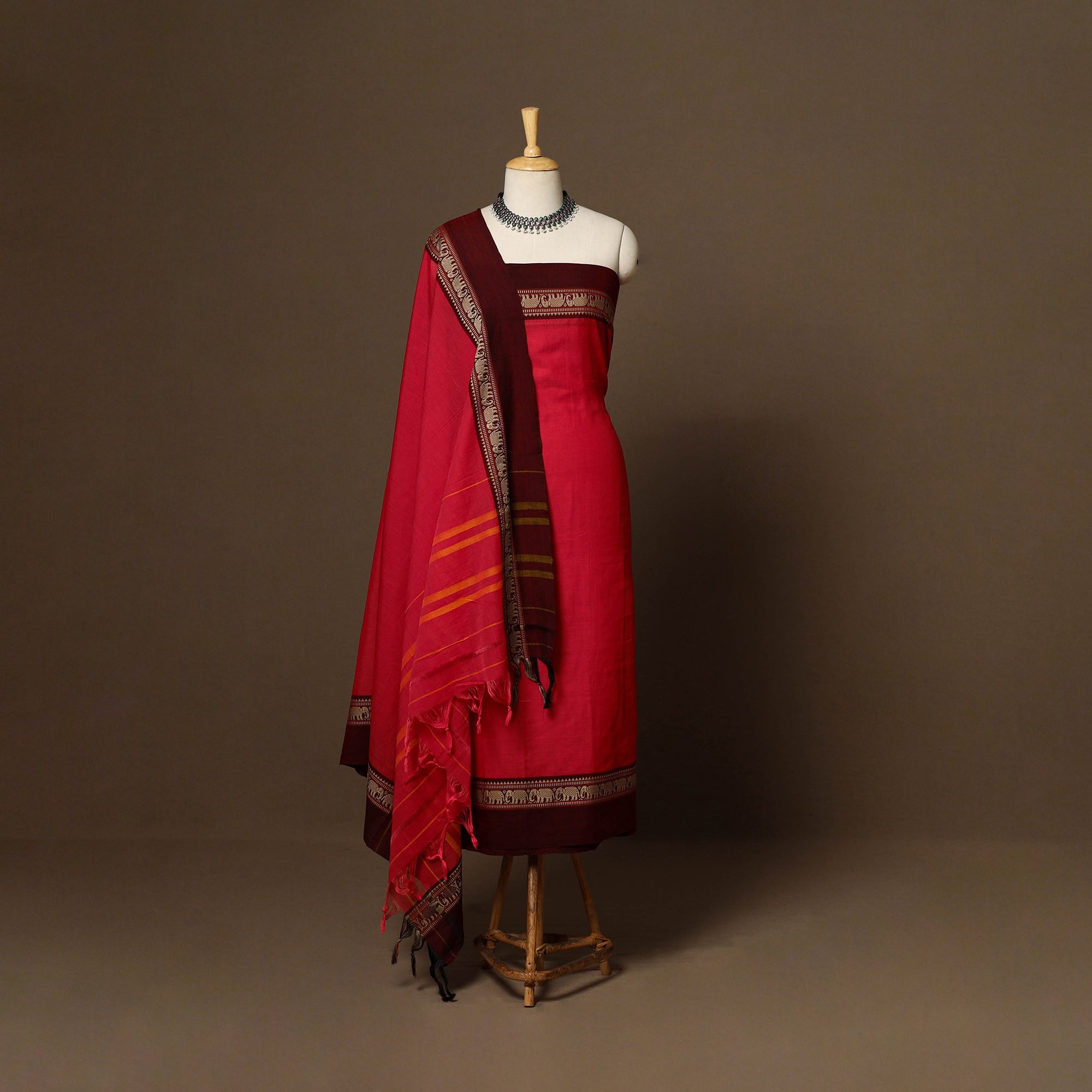Red 3pc cotton dress material set from Dharwad, Karnataka. This set is a tribute to the rich textile heritage of the region, featuring traditional woven border work that adds a touch of sophistication. The set includes a beautifully crafted kurta piece, a matching bottom/salwar piece, and a coordinating dupatta. Crafted with precision and care, this suit material set offers both style and comfort. Whether you're attending a festive occasion or a casual gathering, this ensemble is sure to make a lasting impression.