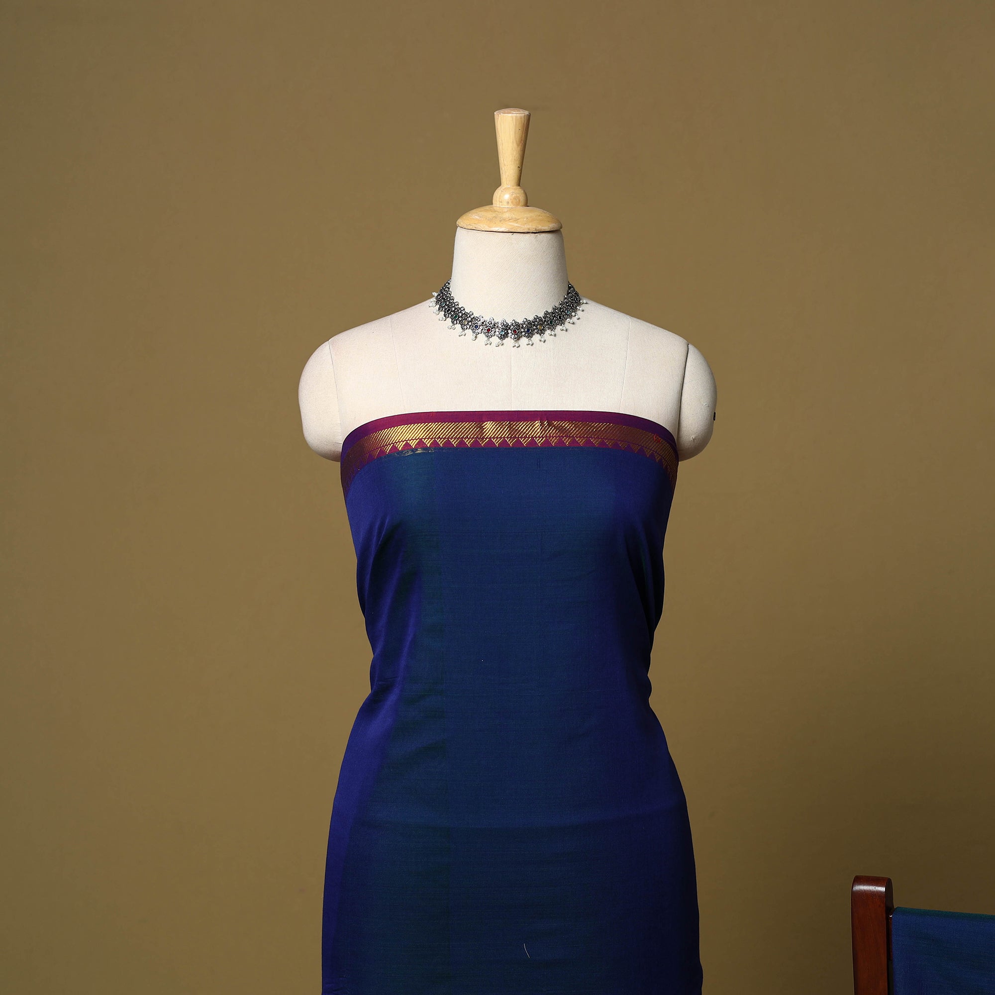 Blue 3pc cotton dress material set with traditional woven border from Dharwad, Karnataka. The set includes a beautifully crafted kurta piece, a matching bottom/salwar piece and a coordinating dupatta. Perfect for festive occasions or casual gatherings.
