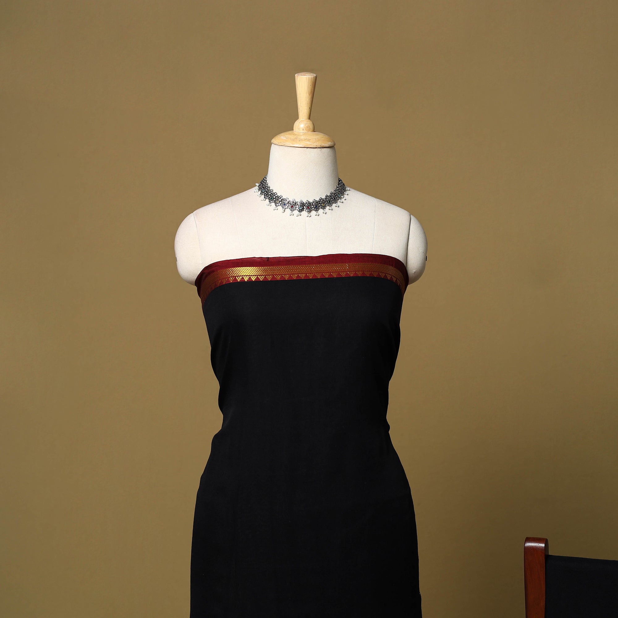 Black 3pc cotton dress material set with traditional woven border from Dharwad, Karnataka. The set includes a beautifully crafted kurta piece, a matching bottom/salwar piece and a coordinating dupatta. Perfect for festive occasions or casual gatherings.