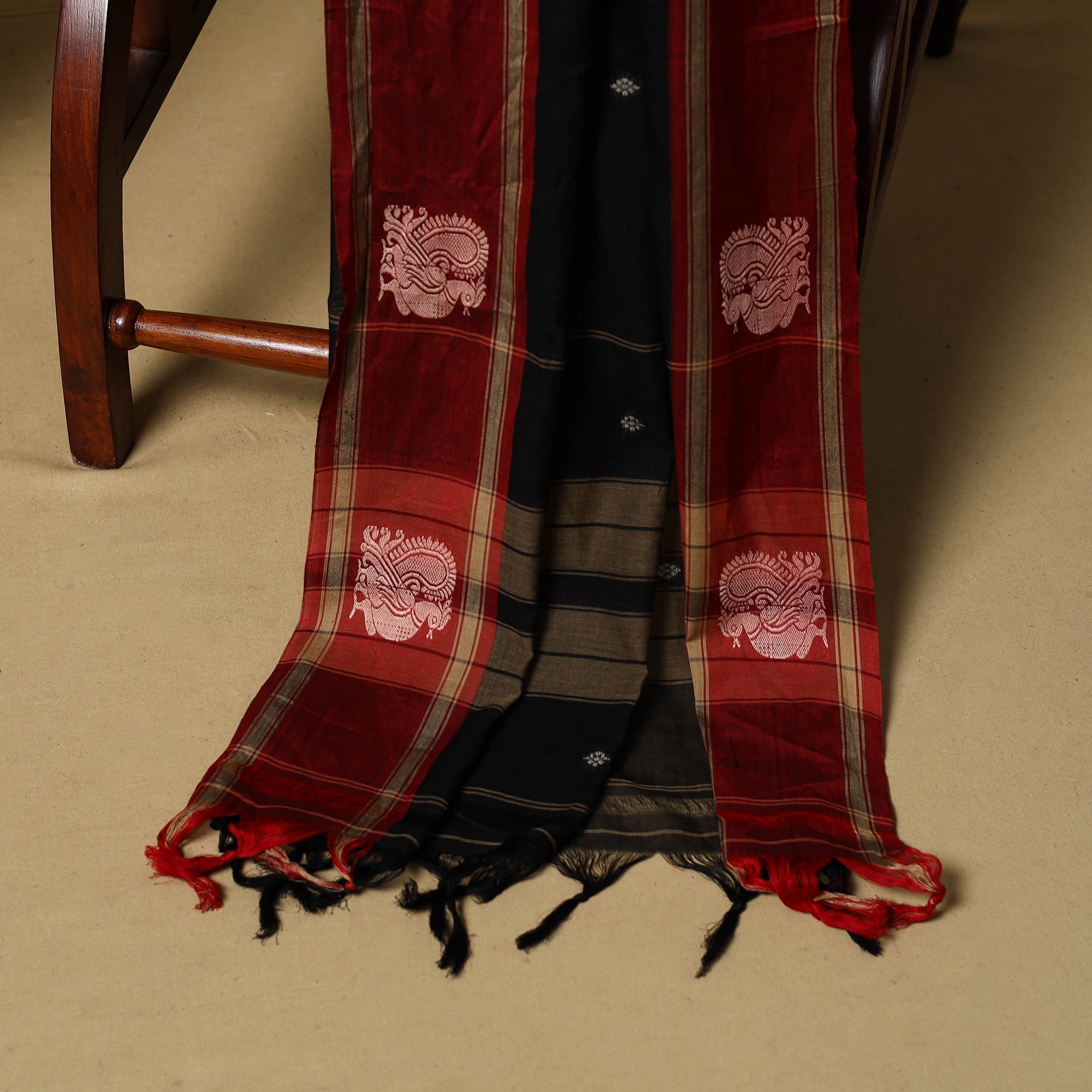 Black 3pc cotton dress material set with traditional woven border from Dharwad, Karnataka. The set includes a beautifully crafted kurta piece, a matching bottom/salwar piece and a coordinating dupatta. Perfect for festive occasions or casual gatherings.
