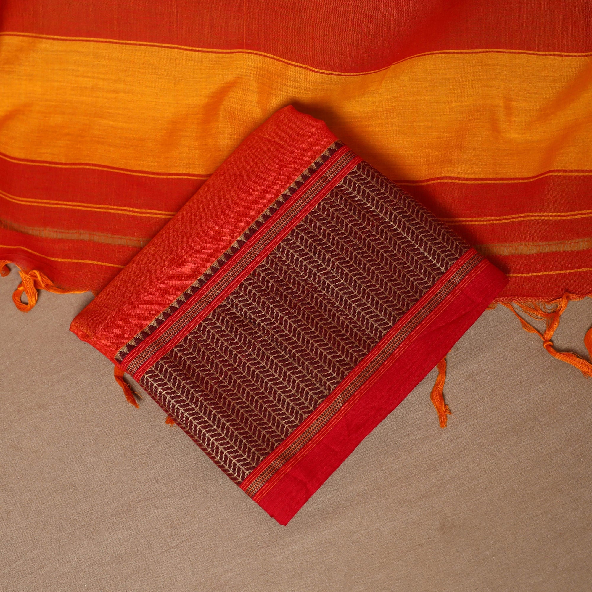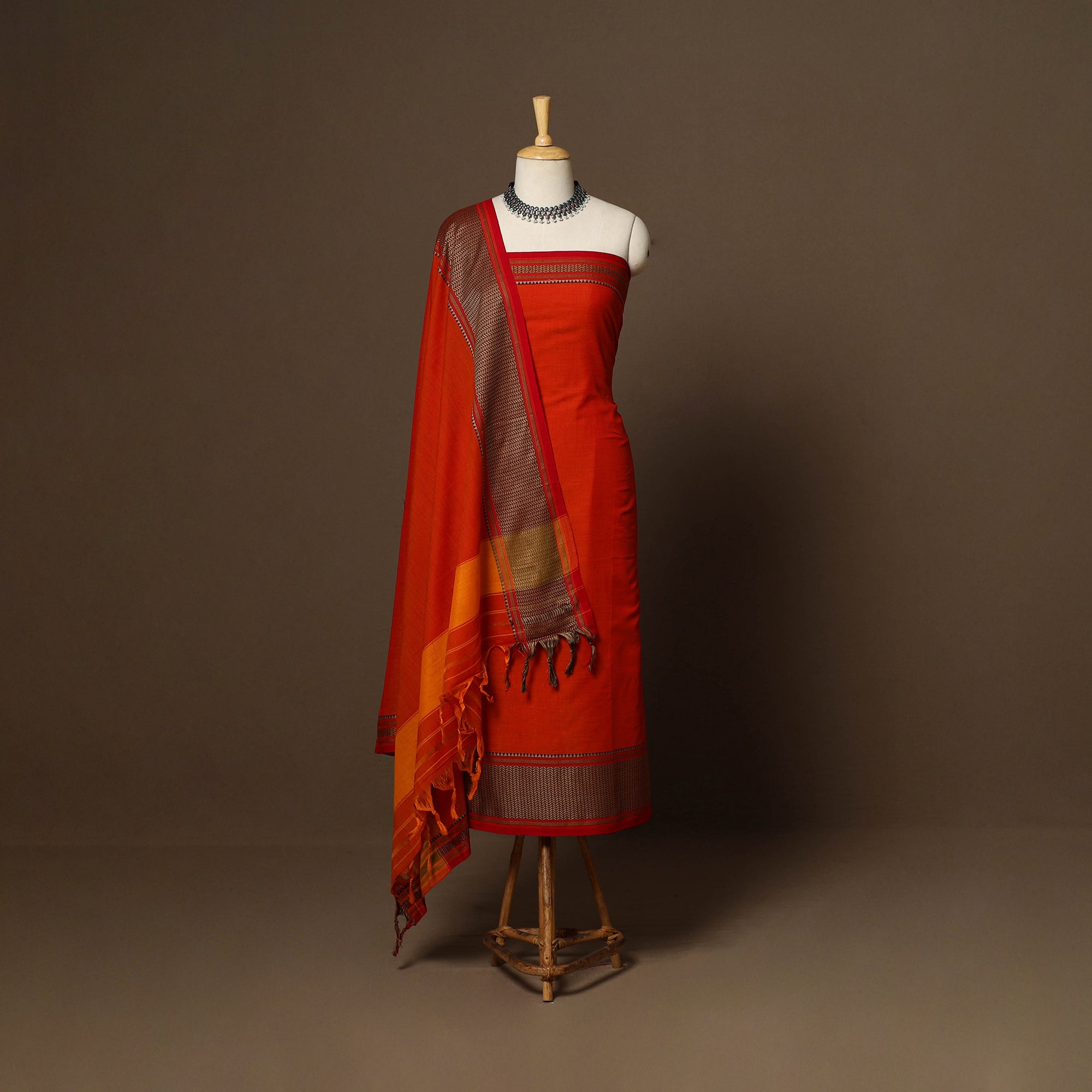 Red 3pc cotton dress material set from Dharwad, Karnataka. This set is a tribute to the rich textile heritage of the region, featuring traditional woven border work that adds a touch of sophistication. The set includes a beautifully crafted kurta piece, a matching bottom/salwar piece, and a coordinating dupatta. Crafted with precision and care, this suit material set offers both style and comfort. Whether you're attending a festive occasion or a casual gathering, this ensemble is sure to make a lasting impression.