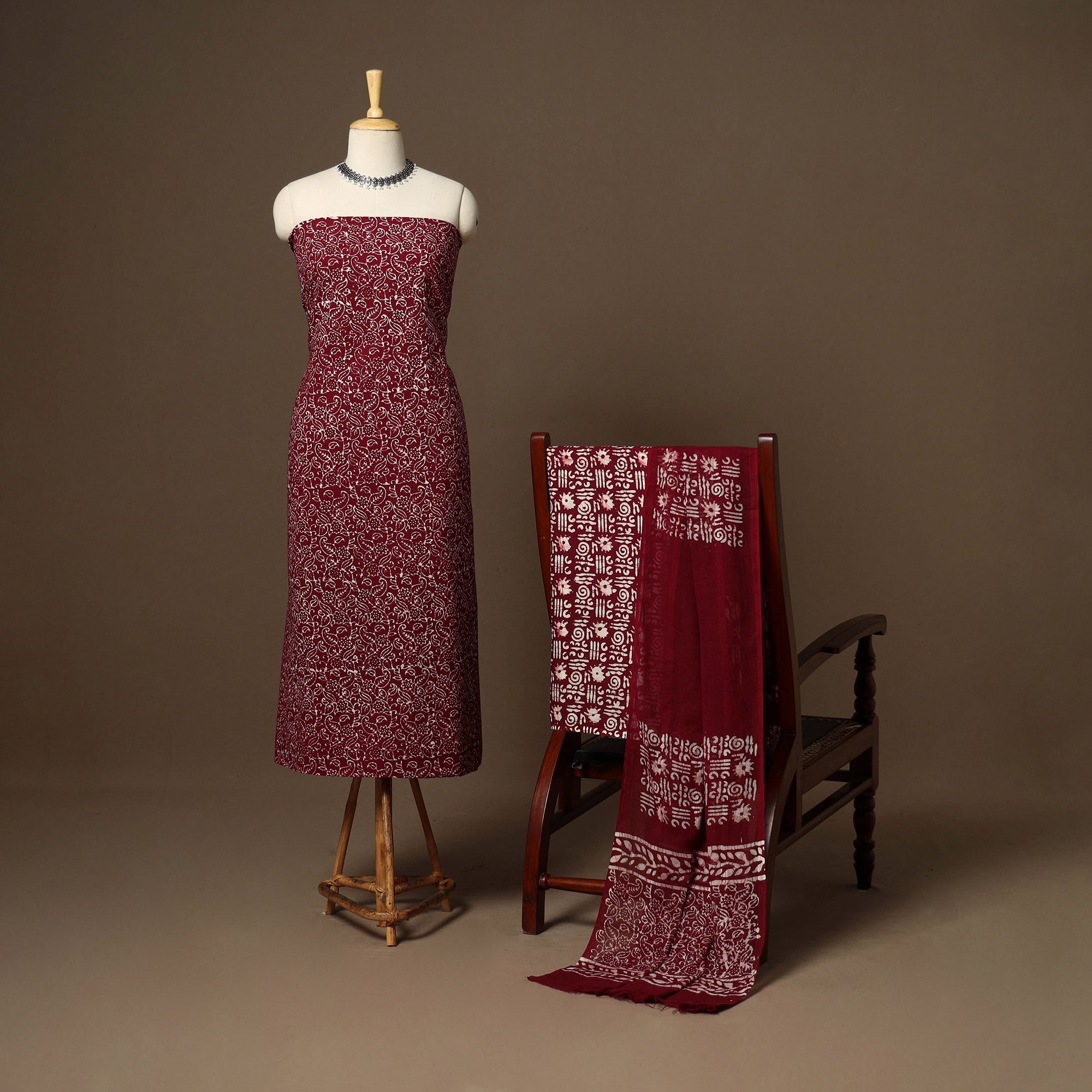 Maroon 3pc hand batik print cotton dress material from Madhya Pradesh is crafted using the traditional wax-resist dyeing technique, known for its bold and artistic patterns. The set includes fabric for the kurta, a coordinated bottom, and a soft mul cotton dupatta. The motifs showcase regional artistry passed down through generations, making it a comfortable and stylish choice for festive occasions or elegant everyday wear. Get it tailored your way to create a uniquely beautiful outfit that reflects your style.