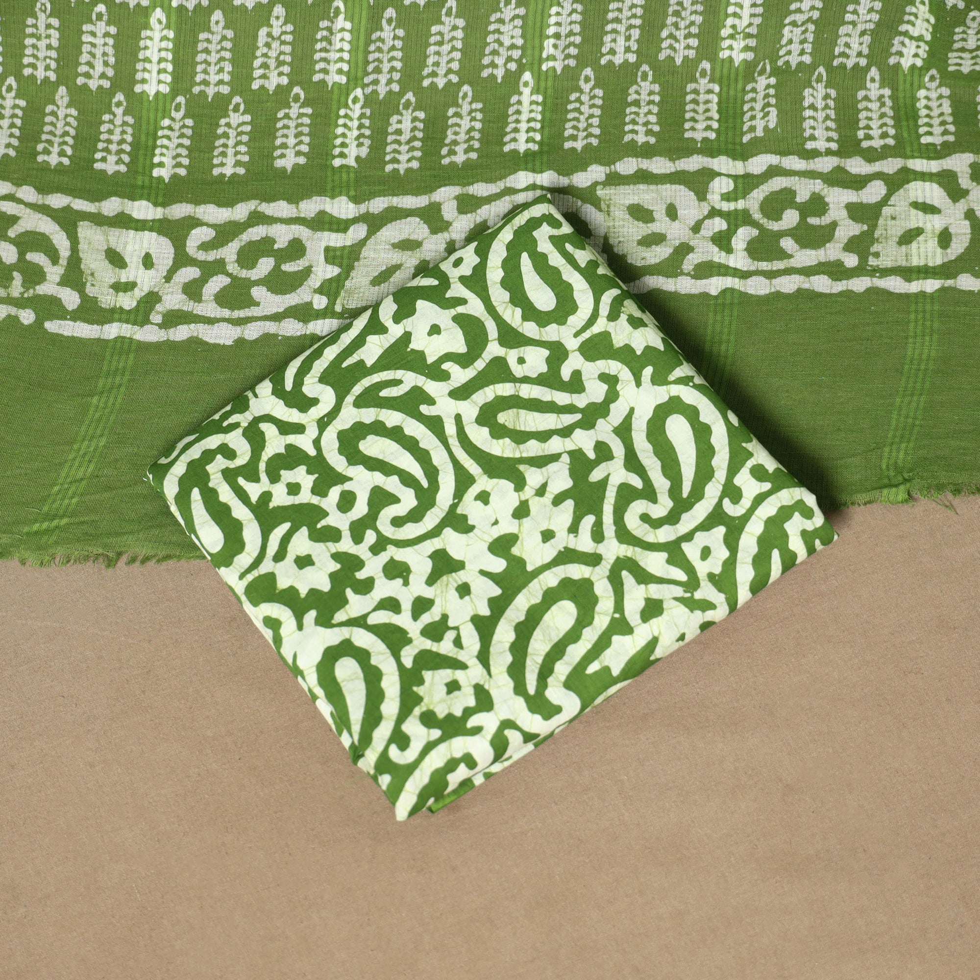 Green 3pc hand batik print cotton dress material from Madhya Pradesh is crafted using the traditional wax-resist dyeing technique, known for its bold and artistic patterns. The set includes fabric for the kurta, a coordinated bottom, and a soft mul cotton dupatta. The motifs showcase regional artistry passed down through generations, making it a comfortable and stylish choice for festive occasions or elegant everyday wear. Get it tailored your way to create a uniquely beautiful outfit that reflects your style.