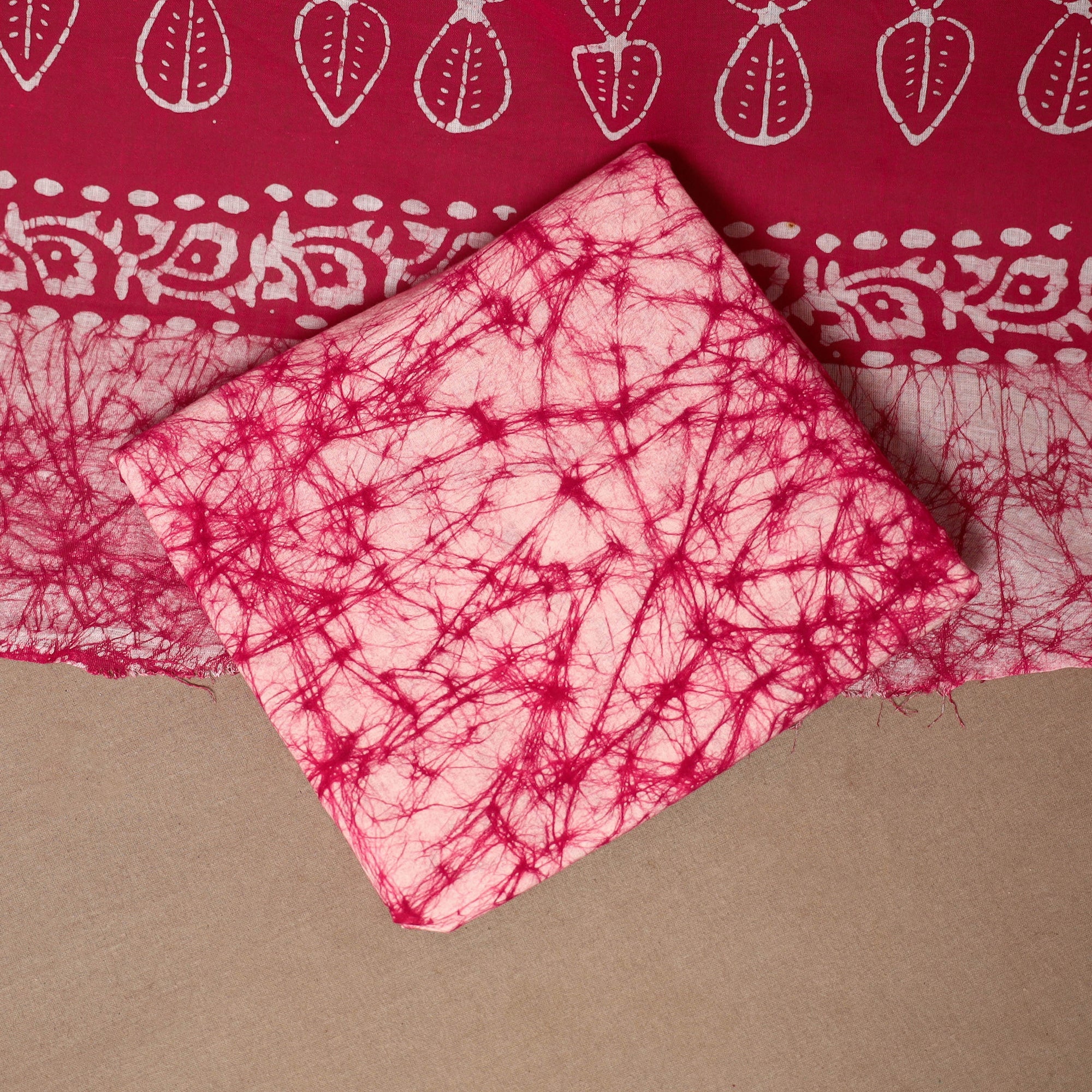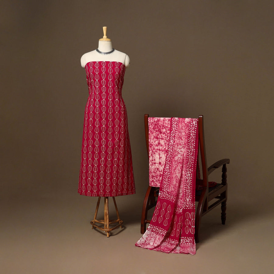 Pink 3pc hand batik print cotton dress material from Madhya Pradesh is crafted using the traditional wax-resist dyeing method, known for its bold patterns. The set includes fabric for the kurta, a coordinated bottom, and a dupatta. The motifs reflect regional artistry passed down through generations, making it a comfortable and stylish choice for festive occasions or graceful everyday wear.