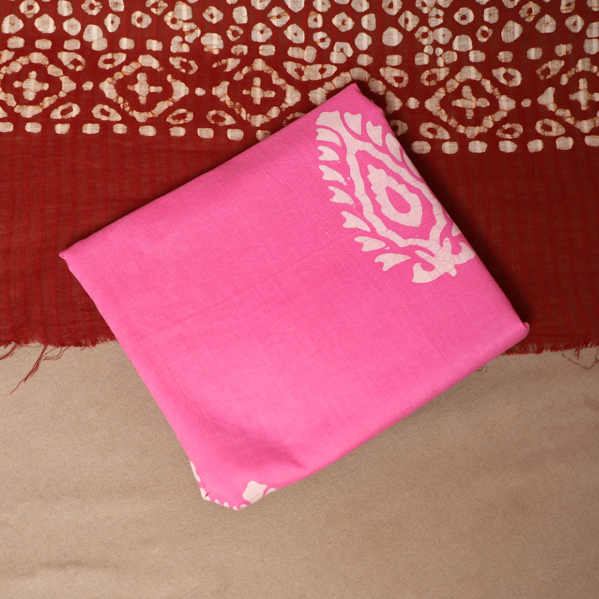 Pink 3pc hand batik print cotton dress material from Madhya Pradesh is crafted using the traditional wax-resist dyeing technique, known for its bold and artistic patterns. The set includes fabric for the kurta, a coordinated bottom, and a soft mul cotton dupatta. The motifs showcase regional artistry passed down through generations, making it a comfortable and stylish choice for festive occasions or elegant everyday wear. Get it tailored your way to create a uniquely beautiful outfit that reflects your style.